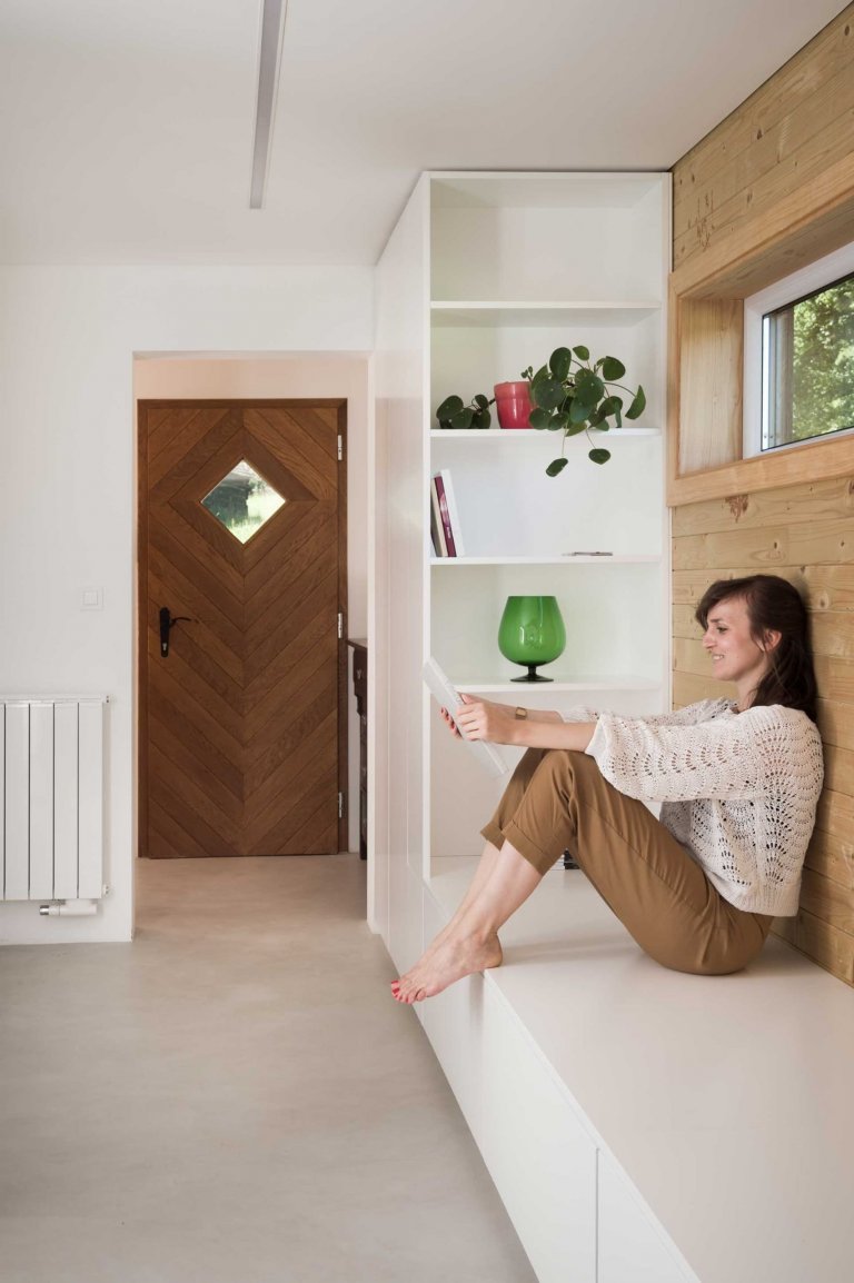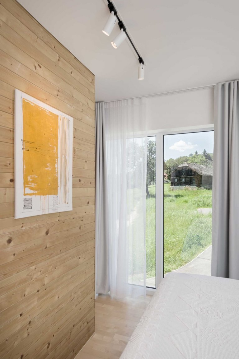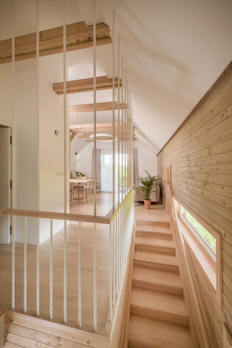 Zbrusu nový interiér je osvěžen řadou oken, které nabízejí překrásné výhledy do přírody. Stěny obložené dřevem doprovázejí obyvatele po cestě v domě a působí velice autenticky. Jako velká výzva se ukázalo sladění několika druhů dřeva a doplnění převažující bílé barvy o jemné odstíny šedé. Smrkové dřevo pak bylo doplněno javorovým. Vzniklo tak hřejivé bydlení, které působí příjemným vizuálním dojmem.