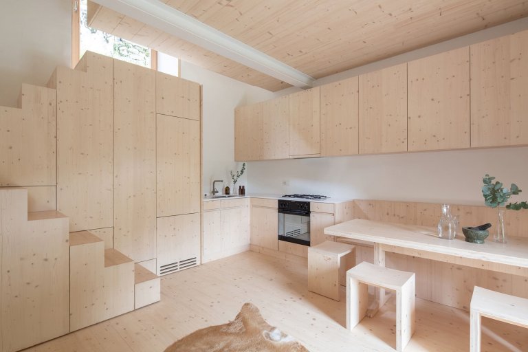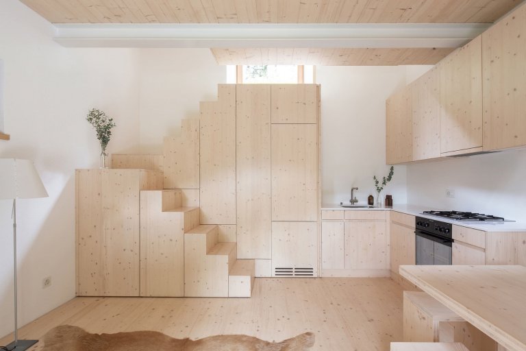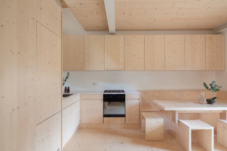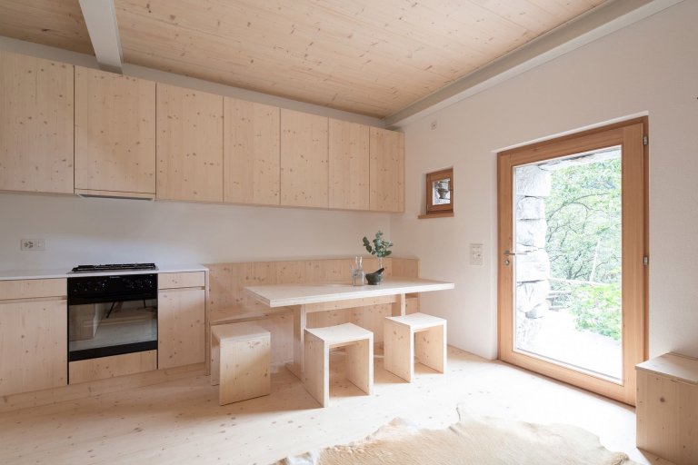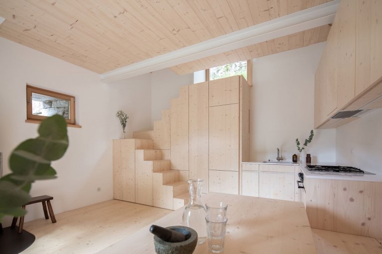 Celý interiér okouzluje jednoduchou paletou materiálů a barev. Všechny povrchové úpravy jsou vytvořeny z dřevěných panelů ve světlé barvě. Příjemný a čistý interiér výrazně kontrastuje s drsným kamenným exteriérem budovy. Ze stejného materiálu je nejen podlaha, kuchyňská linka a schodiště, ale i jídelní kout s lavicí a stolem.