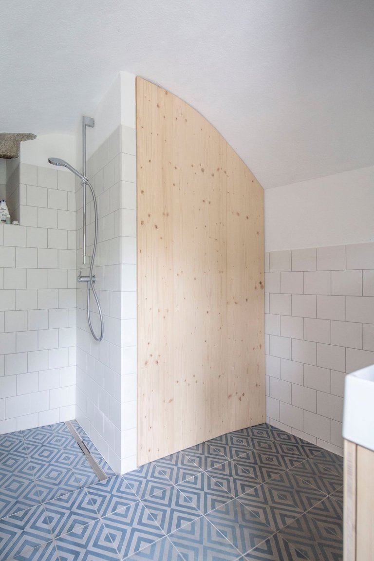 V podkroví najdete jednoduchou ložnici, opět plnou dřeva, s malým okénkem pod střechou. Dřevěnými panely je obložen i strop. Koupelnu s bílými obkladačkami a geometrickou šedo-modrou dlažbou prosvětlují skleněné dveře soukromé zahrady. Ani zde nechybí dřevo.