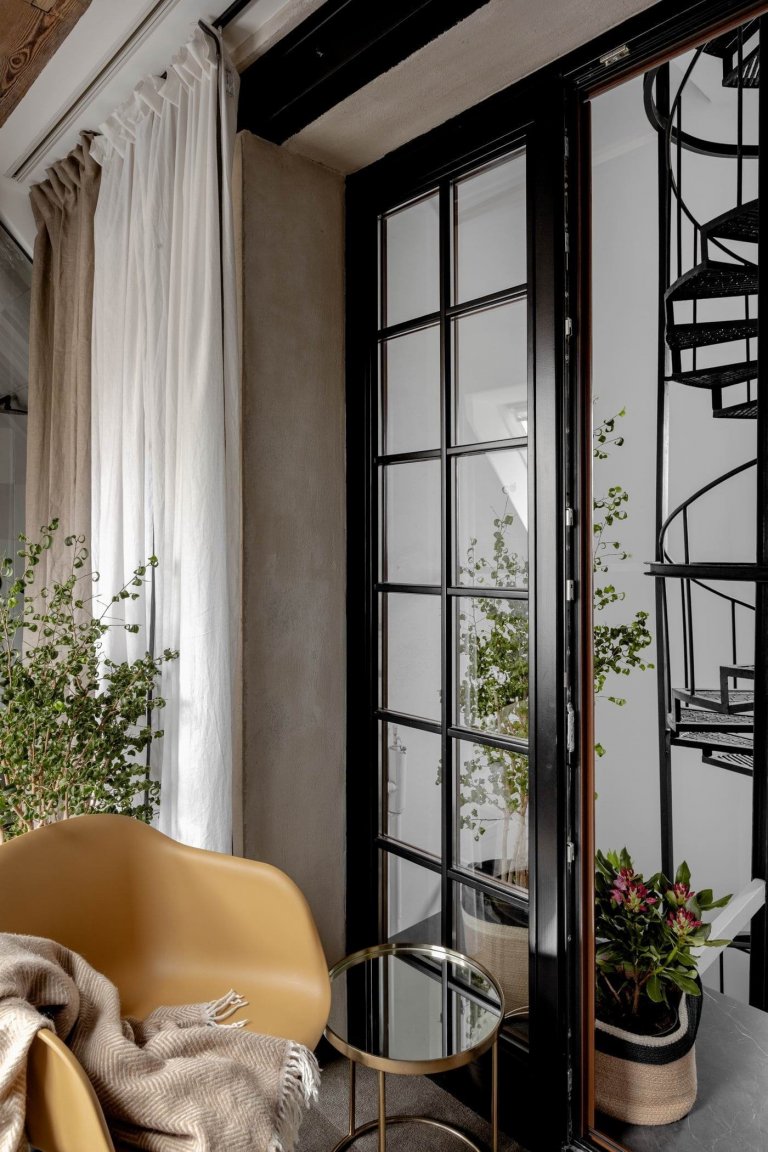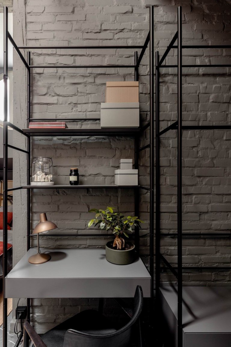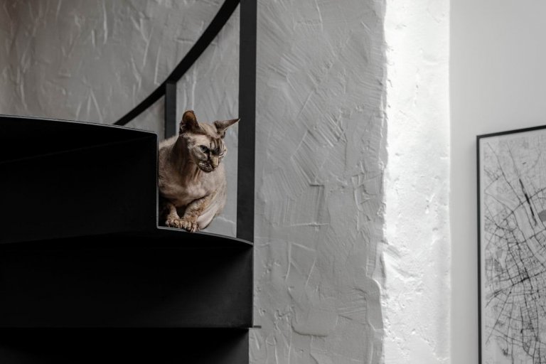 Hra světla a stínu je zde opravdu zajímavá, protože jsou na stěnách různé povrchové úpravy, některé dokonce původní. Základ v černé a neutrálních barvách byl osvěžen moderním nábytkem v sytých barvách. Ve spodní úrovni bytu jsou plně funkční a prostorné pokoje. Jeho výška v nejvyšším bodě dosahuje 6,5 m. Právě výškové rozdíly dělají byt jedinečný a plný překvapení.