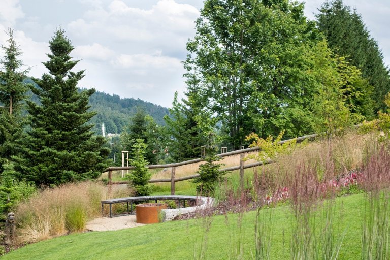 Domov nově získal dechberoucí výhled do krajiny. Do celkového konceptu byly zapojeny vzrostlé jehličnany i horská louka. Prostor dostala také hra s celoroční dynamikou rostlin a kouzelné venkovní umění. Architekti ateliéru Flera stejně jako při ostatních svých projektech vnímali i tady proměnlivost přírody jako největší hodnotu a přínos, který zahrada nabízí. Design zahrady vystavěli na principu přirozeného stárnutí materiálů, na fascinujícím procesu zániku a zrodu. Proto je hlavní vlastností této zahrady pravdivost.