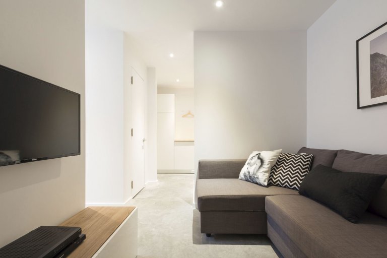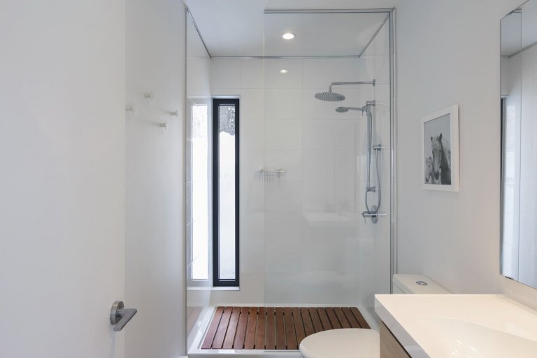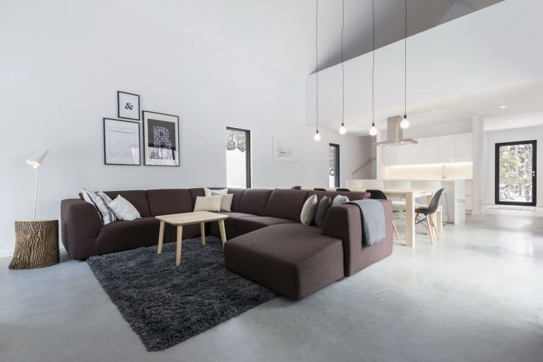 Celým interiérem se nesou světlé barvy, hlavně bílá, která se opakuje na stěnách, dveřích skříněk i na světlé betonové podlaze. Jednoduchý a funkční design s nádechem Skandinávie zde hraje prim. Vše je zařízeno účelně a nenajdete zde žádné zbytečnosti.