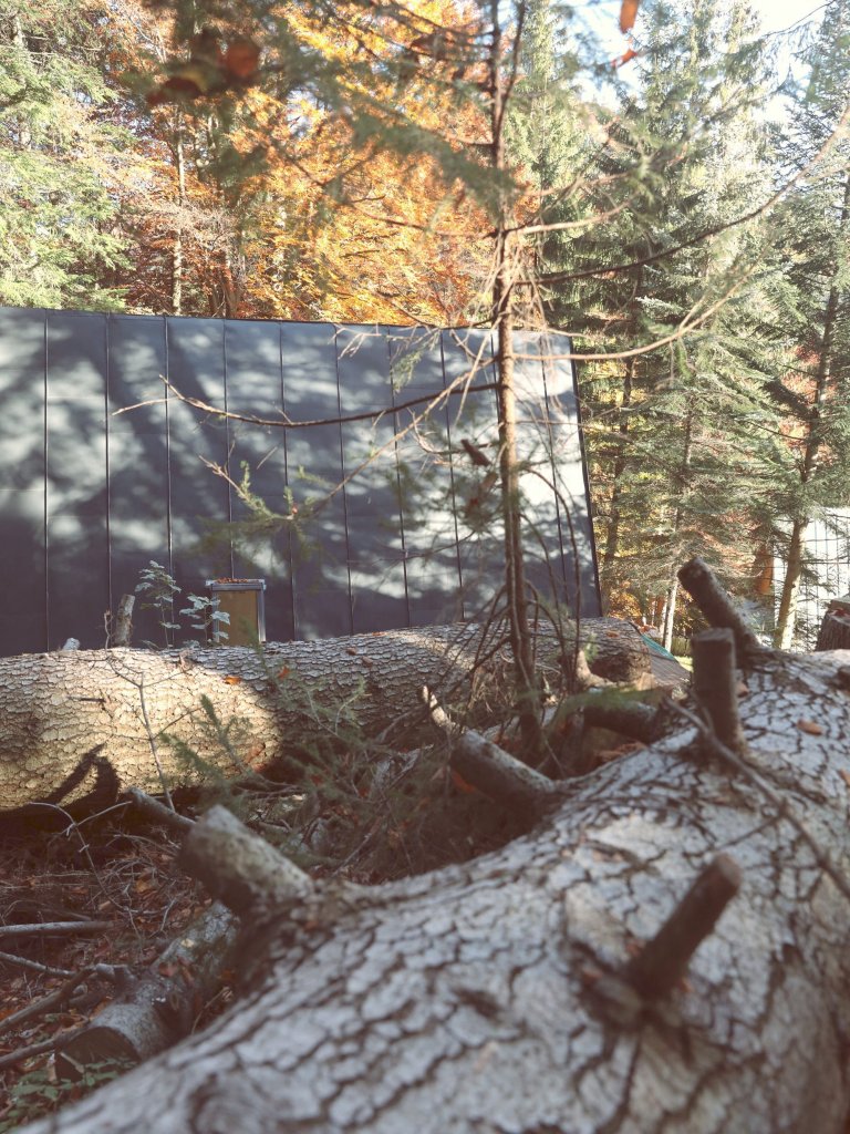 Jak se ukázalo, nosné prvky, střecha i vnitřní schodiště byly zachovány ve výborném stavu a zůstaly nezměněny. Ani v suterénu nebylo třeba žádných velkých oprav. Chata měla zapadat do lesa, do volnosti a divokosti okolní přírody. Kolem chaty se nenachází ani plot či jiné ohraničení pozemku. Pouze hustá zeleň, která tvoří přirozenou bariéru. Díky tomu bylo možné otevřít prostor pomocí celoprosklené štítové zdi. Pro zlepšení tepelně izolačních vlastností chaty byla izolace ve struktuře zdi nahrazena. Uvnitř byla použita nová izolační vrstva minerální vlny a parozábrana ukrytá za OSB deskami ze kterých je pohledová stěna v interiéru. V exteriéru byla zachována původí plechová krytina ošetřená šedým nátěrem, stejná barva je použita i na fasádních profilech na štítové zdi.