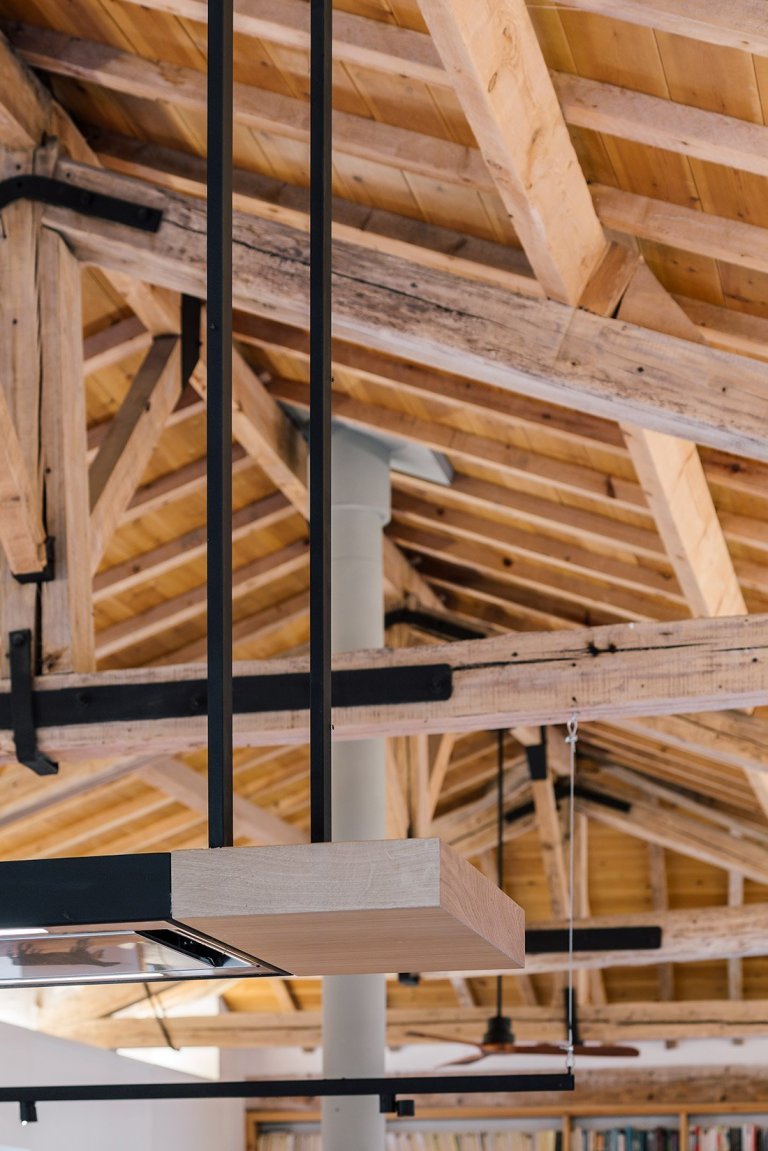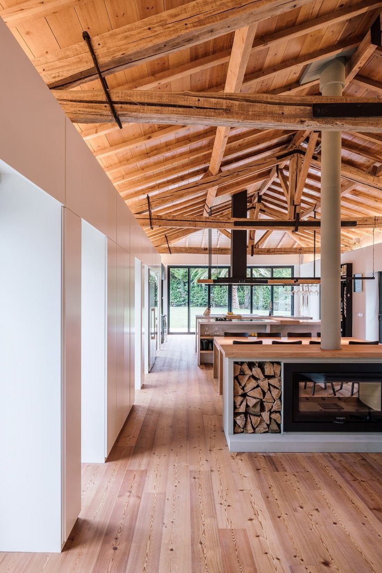 Bývalé stáje se uvnitř domu proměnily v jeden velký otevřený prostor. Tato vzdušná společenská zóna v sobě postupně zaujímá kuchyni, jídelnu, obývací pokoj a kancelář. Všechny tyto místnosti jsou prakticky bez bariér, a tak prostor může volně dýchat. Celá denní zóna má přitom odhalený dřevěný krov. Od této centrální části domu je oddělená jen hlavní ložnice. Druhá ložnice se nachází v patře, do kterého lze vyjít po venkovních schodech. Z důvodu, aby skladovací a technické prostory nenarušovaly atmosféru centrální části domu, umístili je architekti po obvodech stavby.