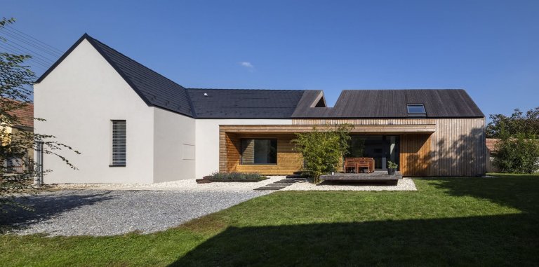 V interiéru i v zahradě přitom dochází k příjemné kombinaci původních a nových prvků. Také hlavní vstup do domu uvedený záhonem levandulí je připomínkou dřívějších částečně krytých zápraží. Na zápraží pak navazuje moderní terasa. V interiéru vládne bílá barva a příjemné světlé tóny dřeva. Jen komunikační chodby a sociální zázemí jsou vymalovány šedou barvou. Jednotlivé místnosti jsou vzdušné a otevřené, přitom však poskytují svým obyvatelům dostatečný pocit soukromí. Domov skrytý za vraty je tak příjemným útočištěm nejen ve chvílích, kdy počasí právě nevybízí k trávení chvil na zahradě.