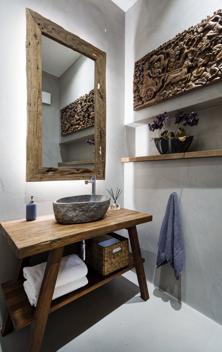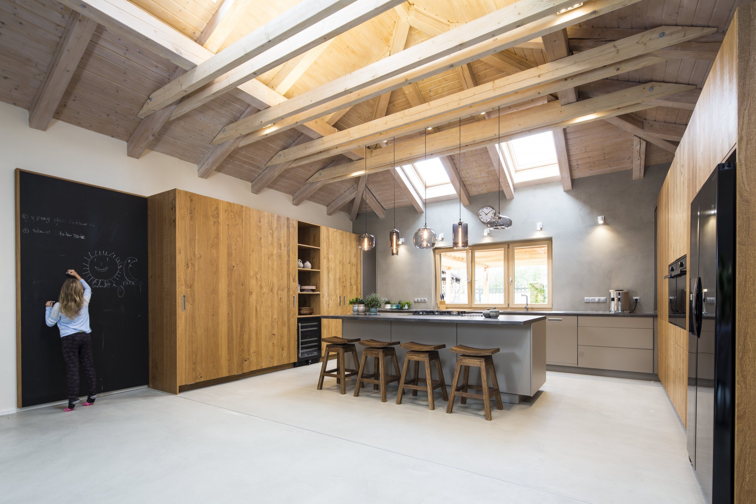Realizace betonových stěrek na podlaze a stěnách dotvořili celek moderního a vzdušného interiéru. V kombinaci s rostlinami a otevřeným stropem s pohledem na trámí utváří neotřelý prostor.