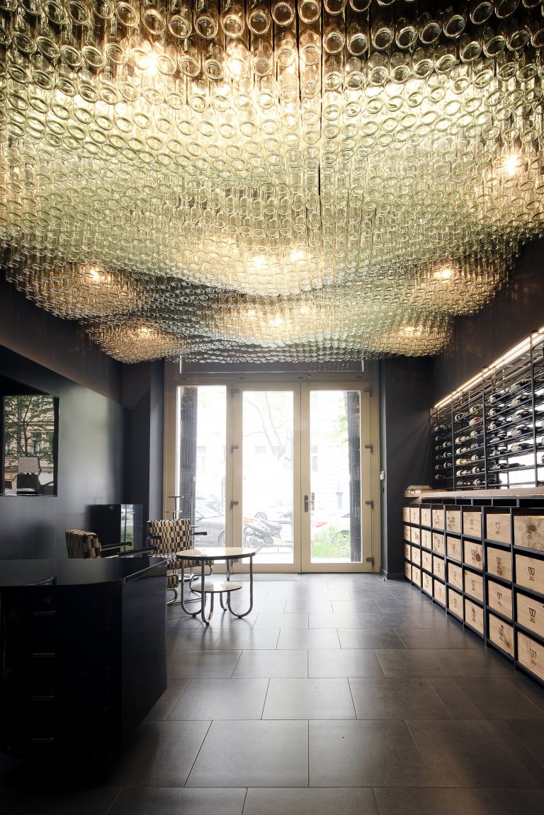 The project was conceived according to the program and aim of the business. It´s was developed and divided in two main areas, the welcoming area in the first floor, and the degustation area in the basement. The first floor is related with the Korunni street, and the glass vitrine allows the visual relation with the space. The ceiling installation with more than 2000 bottles creating a waiving movement is the main design element of the space. The light fixture covers the whole area, and the combination with the furniture from Jindrich Halabala, gives to the space a special and unique character. The degustation area and VIP lounge, in the basement, offers a flexible space for the different events. The brick construction was kept visible, which had been combined with oak detail works and light fixtures. Each element was design, crafted or combined with unique objects from the modernism period and 30´s design.