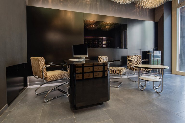 Společnost Wine Society oslovila Modernistu s přáním doladit části nových prostor stylovým nábytkem ze 30. let. Hlavním požadavkem bylo vybavit recepci – vstupní prostor vinotéky a následně vyřešit sezení ve VIP lounge.