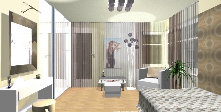 Dívčí pokoj disponuje rohovými okny, které doplnily pásy voálových záclon na průběžné tvarované kolejnici. Jednotlivé pruhy voálů jsou v barevné stupnici béžového ladění. Tapeta s výrazným vzorem v odvážné kombinaci s textilními doplňky odkazuje na mládí. K pocitovému zklidnění místnosti pak slouží jednobarevné polštáře a koberce.