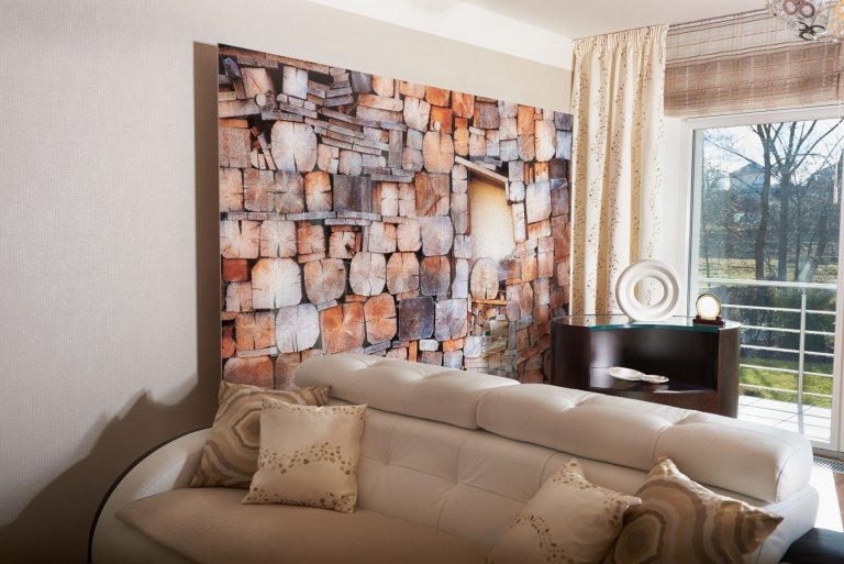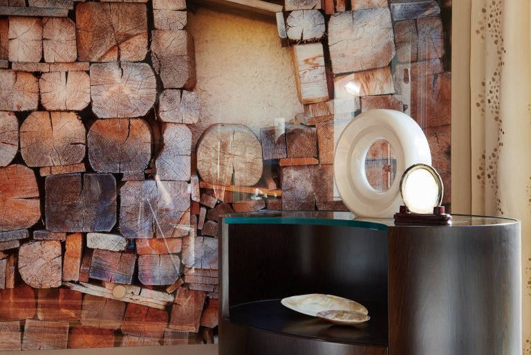 Po konzultaci s majiteli bylo sklo opatřené digitálním tiskem. Skleněná stěna o velikosti 2,6 × 1,7 m se odvolává svým motivem vyskládaného dřeva k rekreačnímu využívání stavby. Staré nařezané trámy svým rázem a barevností dřev připomínají i historii tohoto domu.