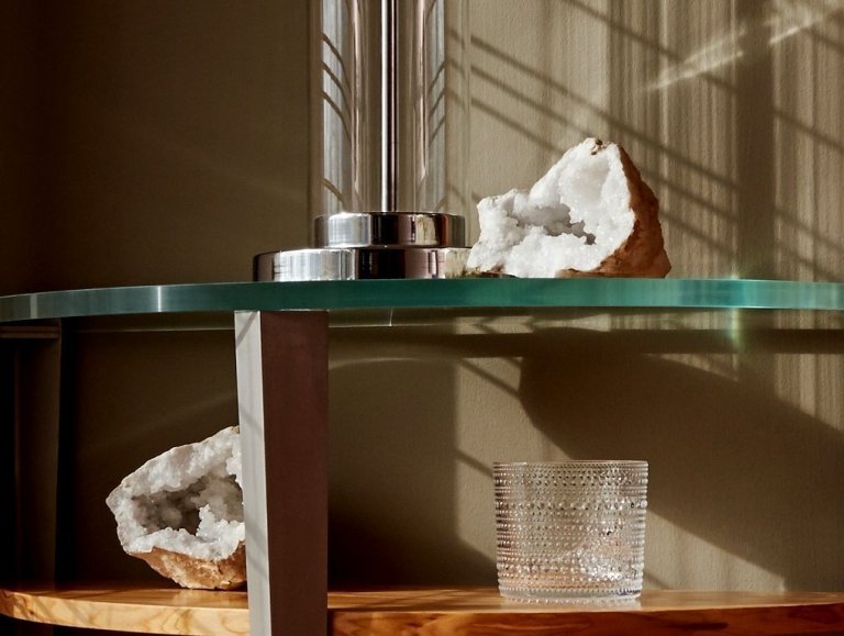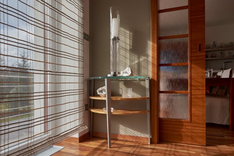 Prosvětlený prostor před okny doplňuje dýhovaný nábytek se skleněnými horními deskami. Mobilita a organické tvary nábytku společně s odrazy ve sklech podporují lehkost prostoru před prosklenou stěnou dělící interiér od exteriéru.