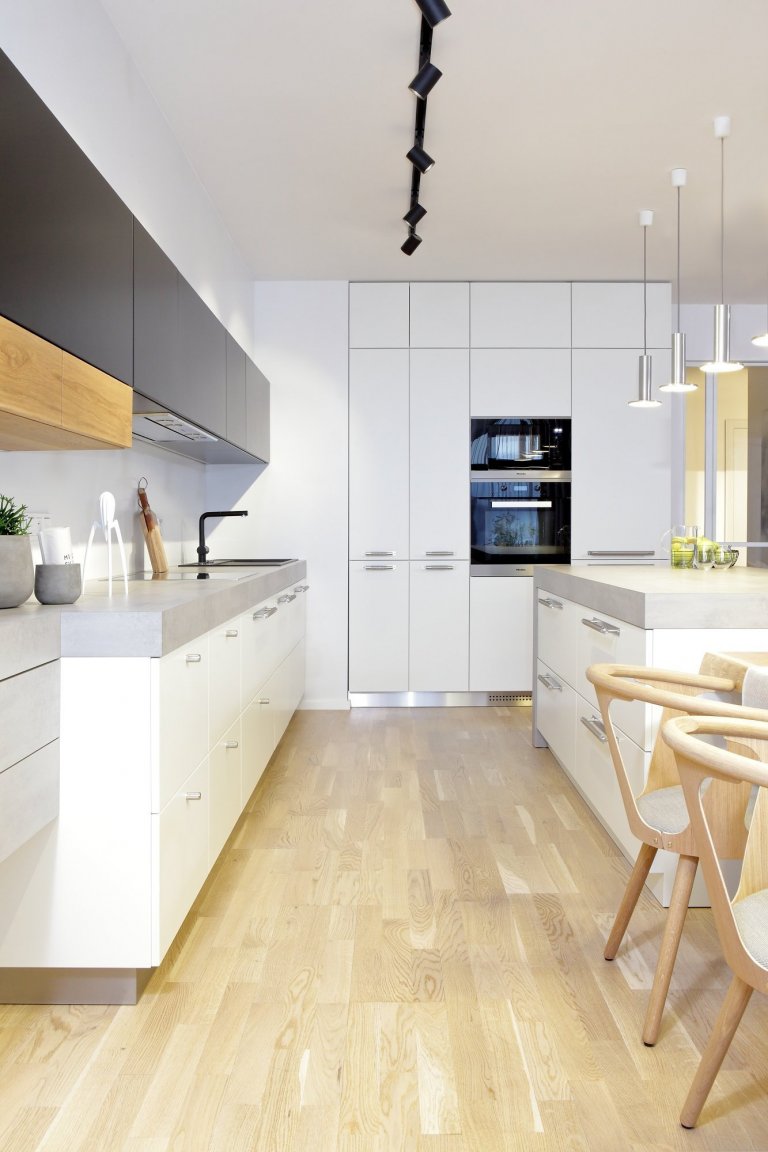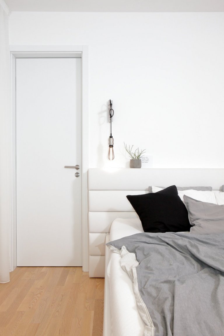 Průchody pod dveřmi jsou plynulé, bez přechodových lišt. Napojení na dlažbu v koupelnách je řešeno subtilním tmelovým spojem a v jedné výškové rovině, jelikož byl developer schopný nám takto podlahu s tímto záměrem stavebně připravit.