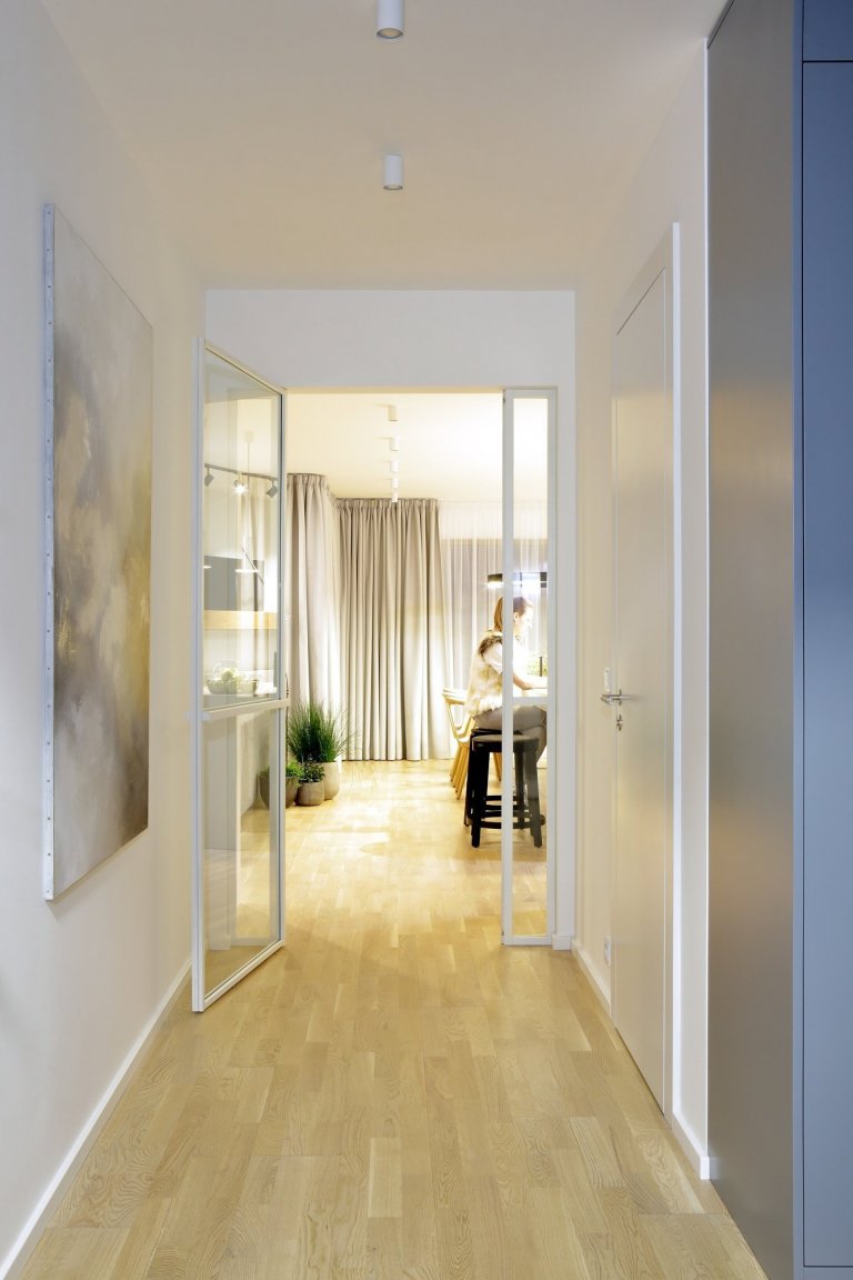 Zámečnici zde měli velkou úlohu jak v případě sprchových zástěn, tak v případě dveří ze zádveří, kterými se prochází do obývacího pokoje s kuchyní.