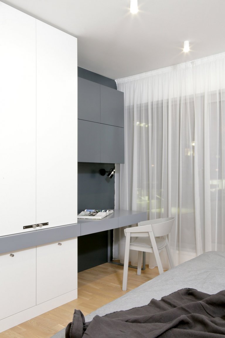 Veškerý nábytek v interiéru je lakovaný v matu, dřevěné plochy jsou z masivu. Vše bylo řešené na míru, i vč. postelí od firmy Polstrin, která nám zde upravovala výšky a šířky čel.