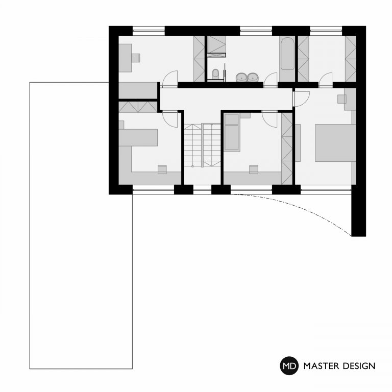 Zahradní fasáda má dominantní prvek stítnění pomocí obloukové křivky, která vybíhá z ploché fasády směrem k sousednímu domu. Je ukončena na jeho hranici a navazuje na šířku tohoto sousedního objektu. Navíc poskytuje stínění ložnici rodičů.