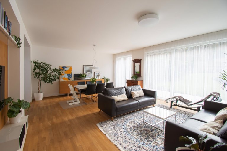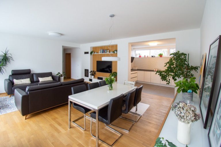 Vnitřní dispozice domu je velmi přehledná a pragmatická. Obytné místnosti jsou všechny až na pracovnu orientovány do zahrady a za sluncem. Technické provozy, šatna a koupelny jsou naopak orientovány směrem do ulice.