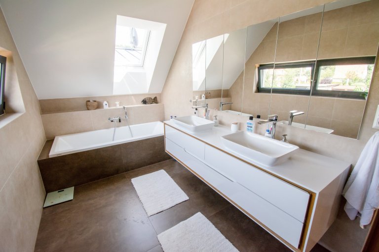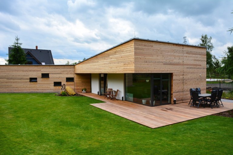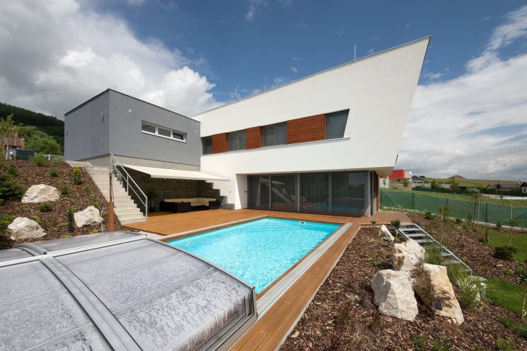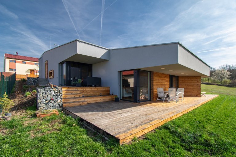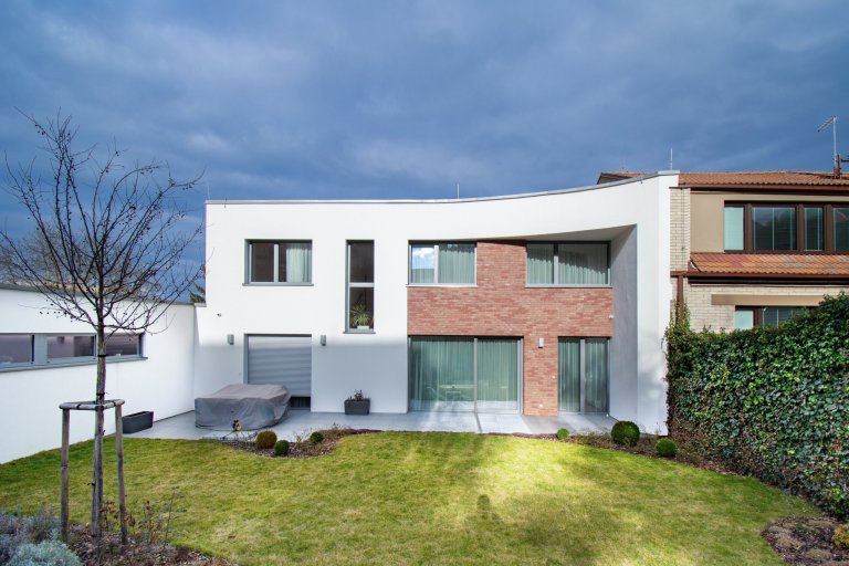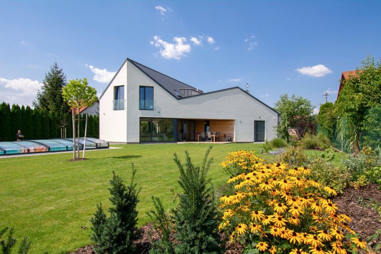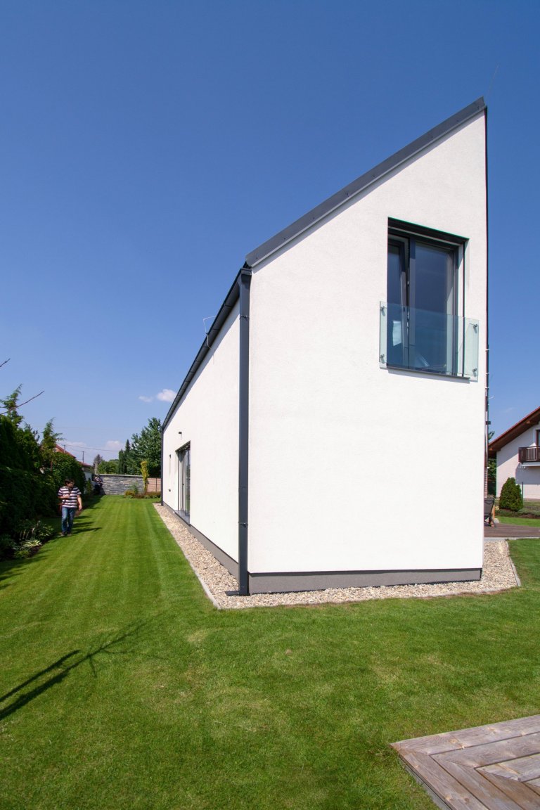 Fasády jsou tvořeny bílou omítkou zkombinovanou s dřevem a plechovou fasádou. Tyto materiály jsme použili jako čisté řešení pro zvýraznění moderního tvaru domu.