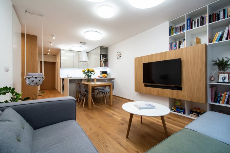 Přízemí obsahuje obývací pokoj s kuchyní a jídelnou, dále pokoj pro hosty, technické zázemí domu a garáž. Horní patro slouží pro relaxaci a jsou v něm umístěny velký dětský pokoj, ložnice, koupelna a spousty úložných prostor v šatnách.