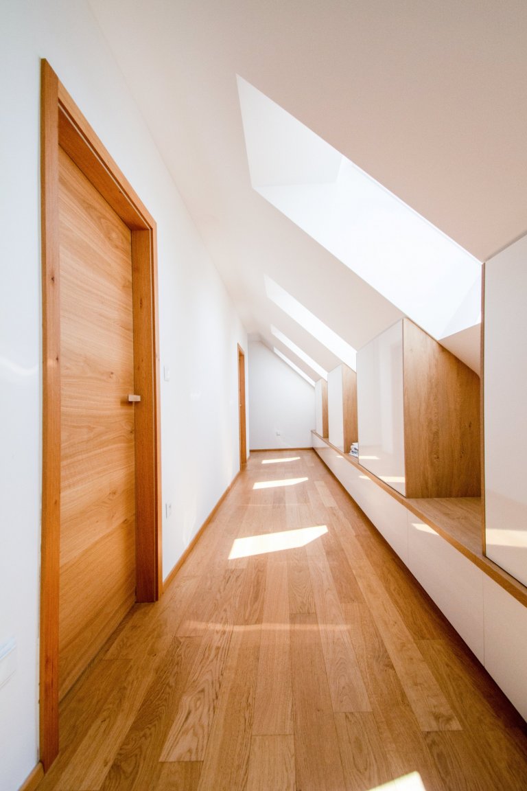 Územní plán obsahoval požadavek na šikmou střechu společně s respektováním hostorických souvislostí jako je tvar domu a orientace hřebene střechy. Při návrhu jsme tyto požadavky dodrželi a navrhli jsme zastřešení dvěma šikmými střechami. Střechy mají různé sklony, díky čemuž bylo docíleno moderního a dynamického vzhledu. Pod vyšší střechou se nachází podkroví a pod nižší střechou je umístěno skladovací zázemí domu.