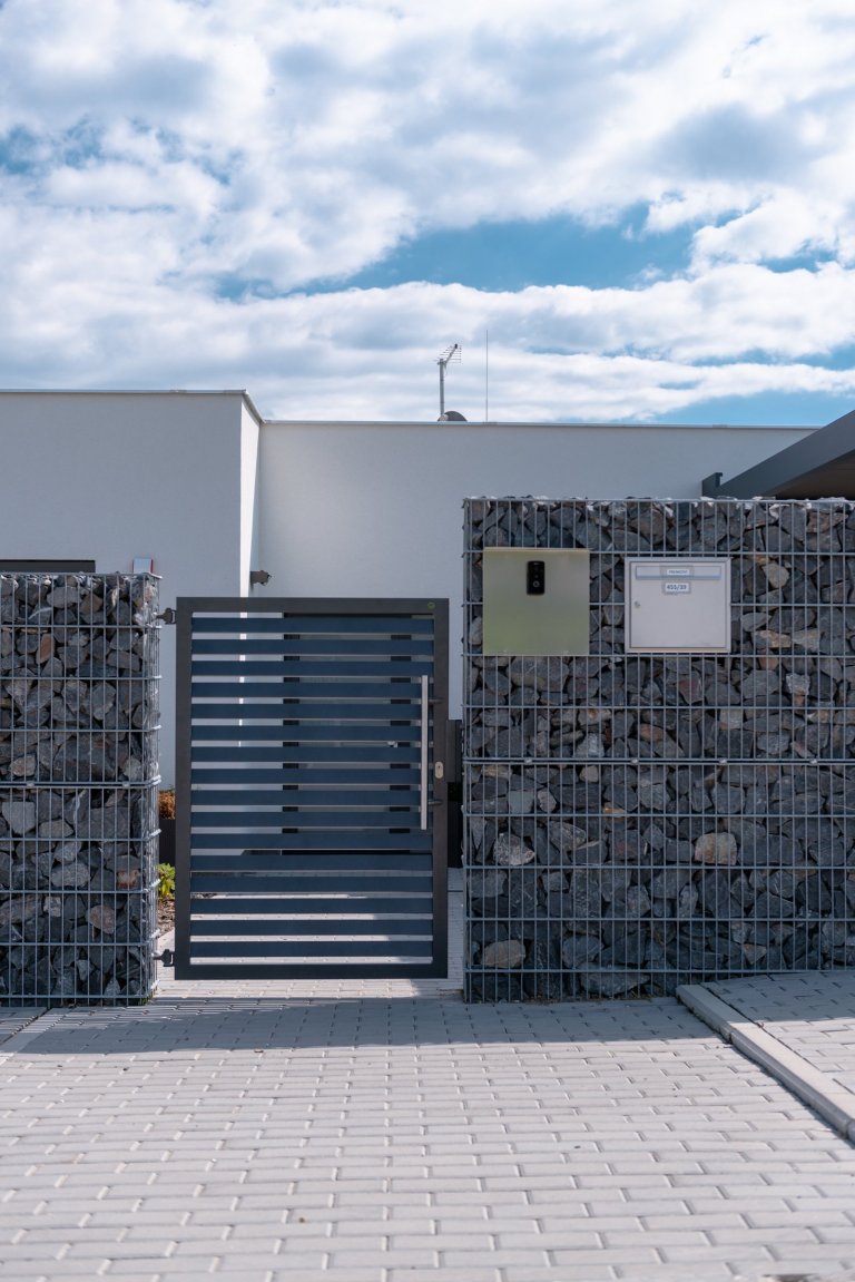 Klient si přál, aby plot zajišťoval soukromí a zaclonil hlavně příjezdovou část, poněvadž dům je pod úrovní ulice. Nakonec jsme vybrali kombinaci gabionového plotu Rock a design Half pro branku a bránu. A mohli jsme se pustit do práce.