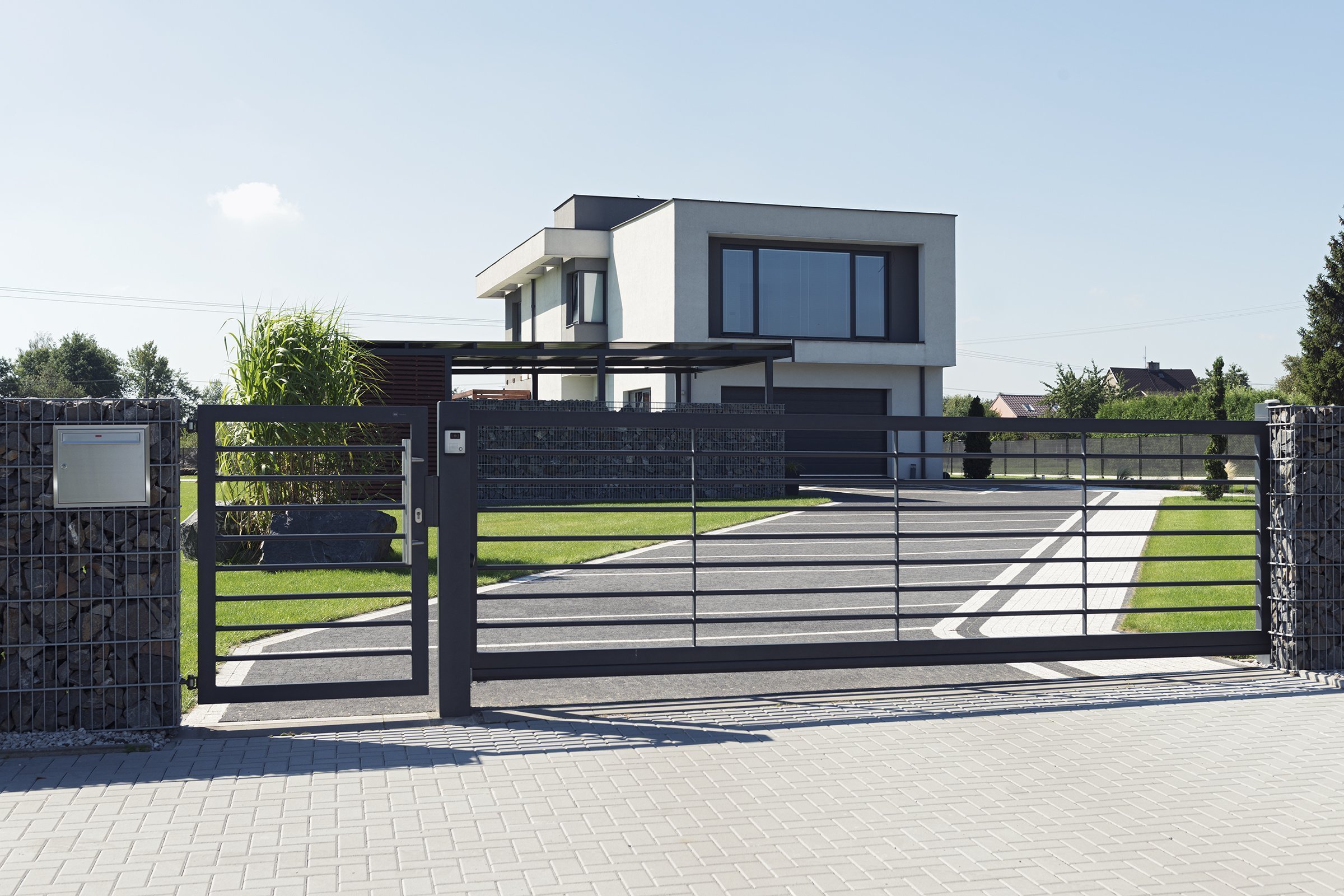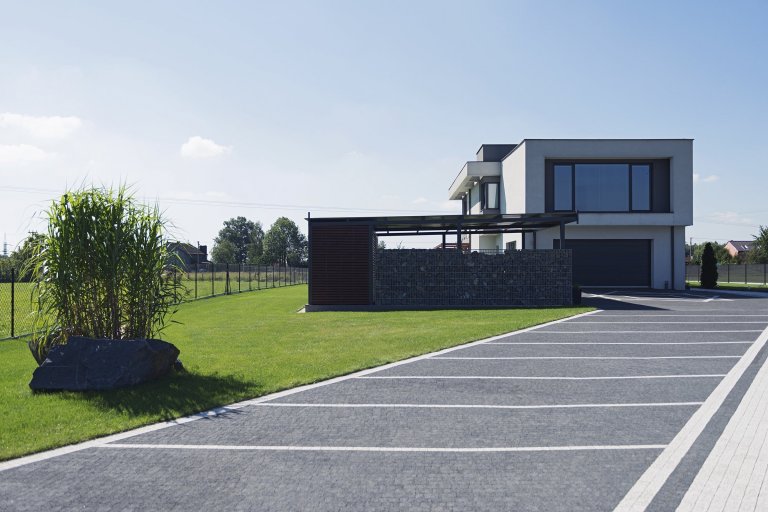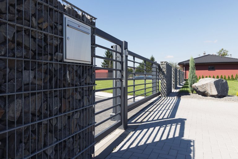 Vjezd v designu Airy, kombinovaný s gabiony Rock (rodinný dům, Orlová).