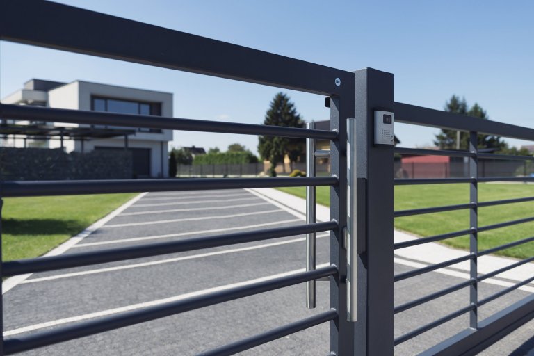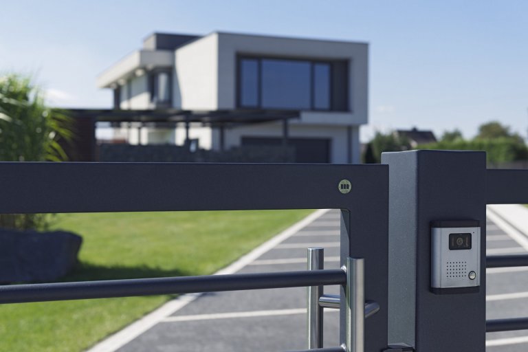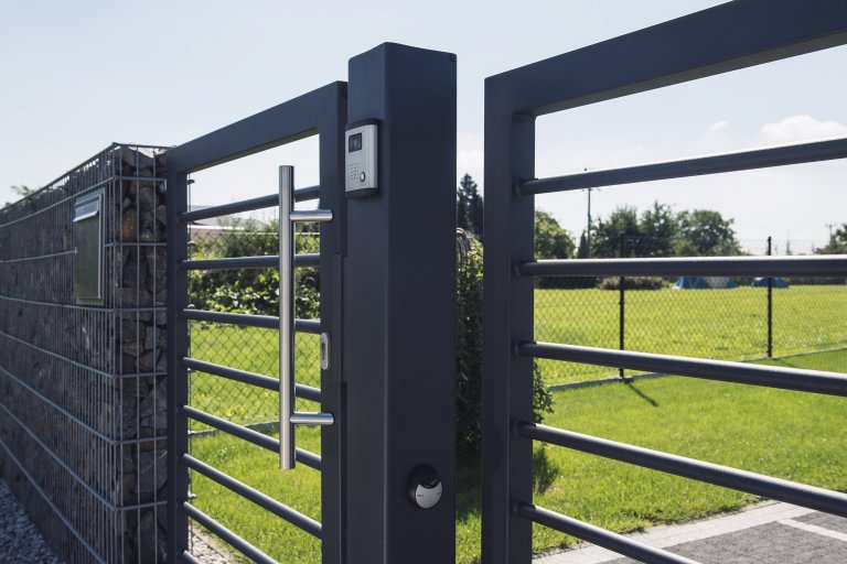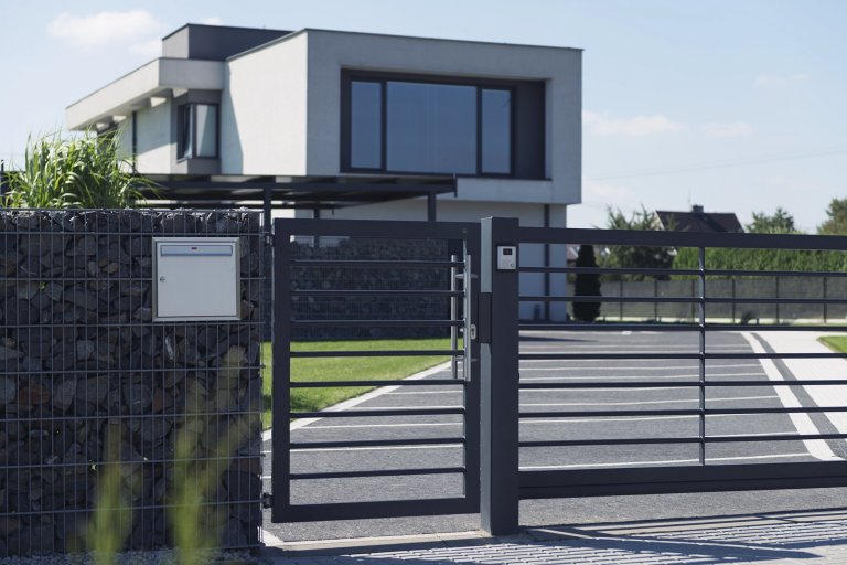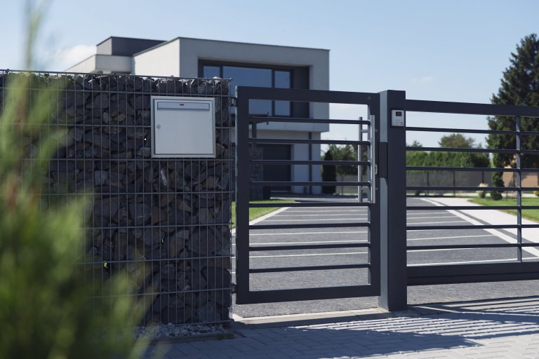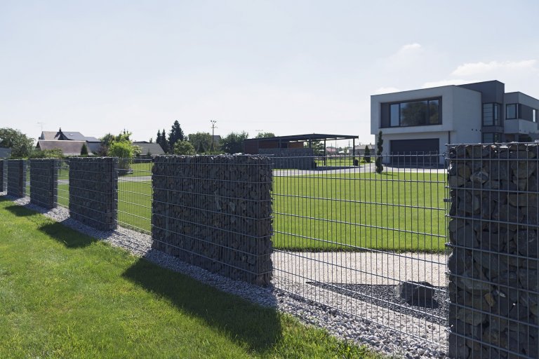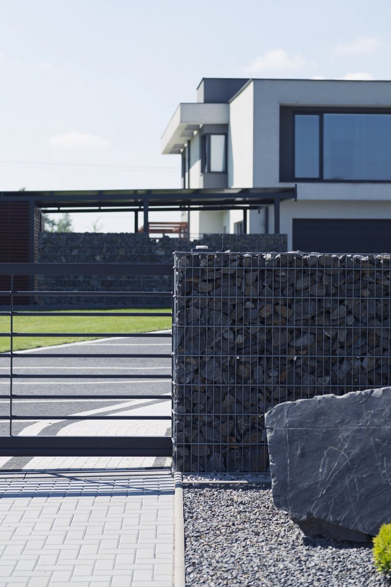 Funkcionalisticky pojatý dům, kde se slušelo nechat prostor okolo dýchat. Navrhli jsme tedy kombinaci otevřeného plotu a gabionu. Řada Airy ideální volba (samonosná brána s brankou), dílce prům. oplocení kombinované s gabiony Rock. Vše krásně dokreslují solitérní kameny v prostoru kolem domu.