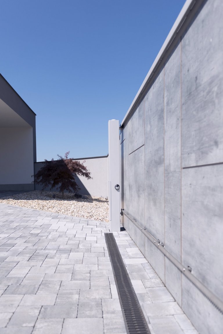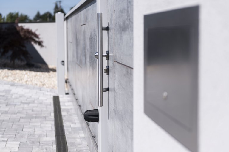 Ploty řady Full mohou mít díky materiálu prakticky jakýkoliv vzhled. Obkladové desky jsou z vysokotlakého laminátu, který je typický svou vysokou odolností. Klient si přál zachovat soukromí a soulad s designovými prvky stavby. Motiv Skyline, který imituje vzhled surového betonu byl tedy jasnou volbou. Pro samonosnou bránu zde nebylo dost místa, proto jsme navrhli jiné technické řeení - posuvnou bránou na kolejnici s nerezovými komponenty.