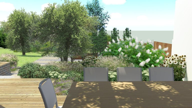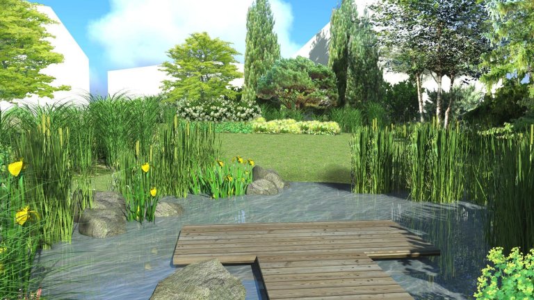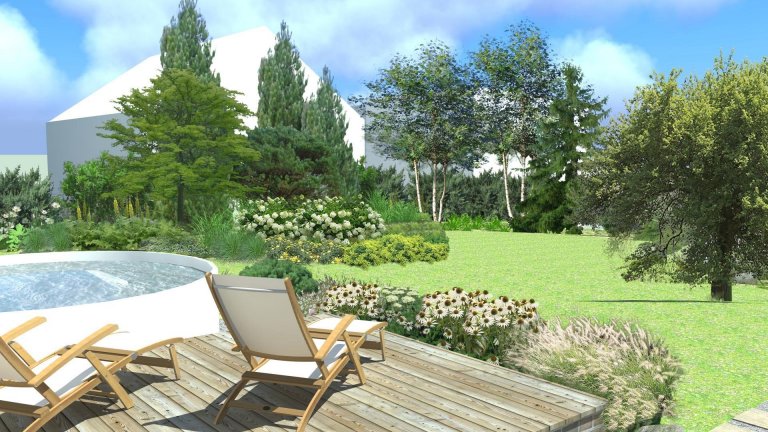 Zahrada v Podještí se nachází na maloměstě a majitelka si přála mít zahradu s pasážemi i hodně přírodními, což jí návrh zahrady splnil především v okolí tůňky. Jednalo se o zadání netradiční, jelikož byl vytvářen návrh bez projektu domu a tím byla jeho podoba předurčena, jelikož je potřebné, aby požadované prvky v zahradě navazovaly i na interiér domu.