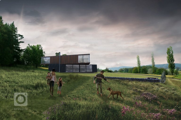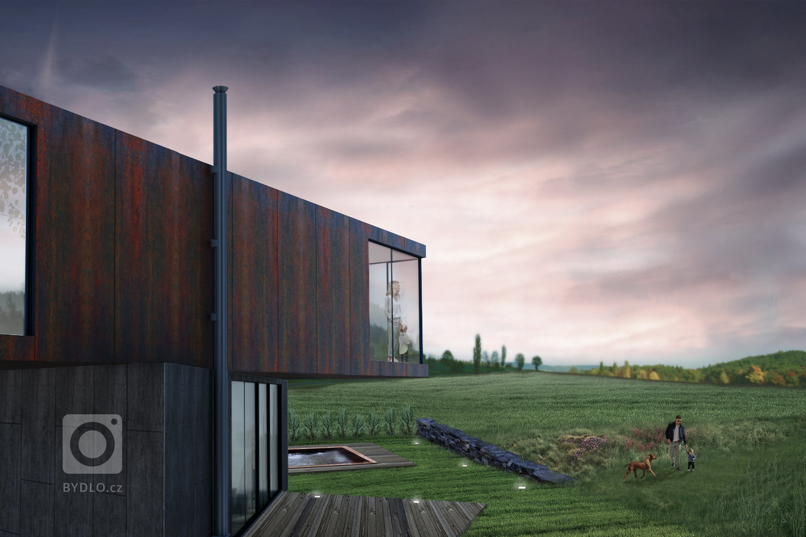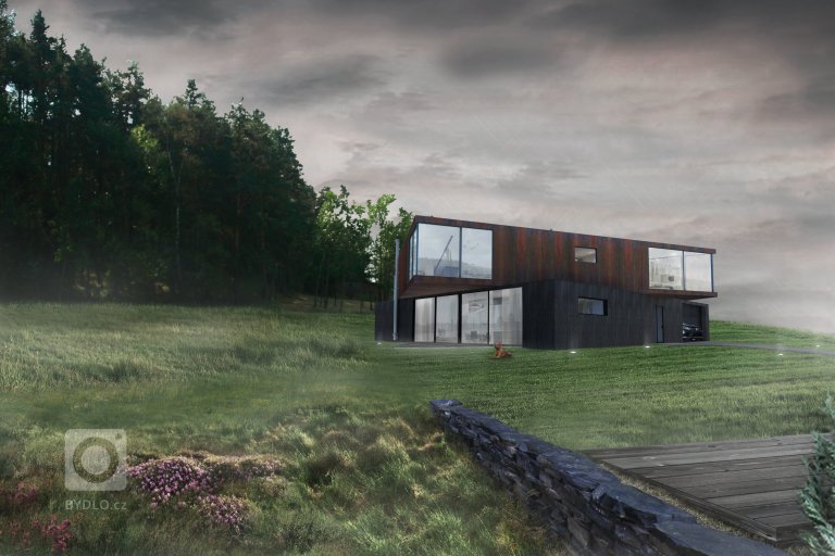 Parcela je orientována směrem do skvostného výhledu na krásnou českou krajinu. Její hranice nesousedí s žádným dalším pozemkem a vzhledem k převýšení a sklonu terénu, se nachází na částečné samotě. Pozemek o výměře 1260 m2, je poměrně atypického tvaru, v podobě přibližného trojúhelníku. Dům svým umístěním, členěním, i tvarem naprosto respektuje terén a využívá exponovaných výhledů, které v tomto návrhu hrají primární roli. Hlavní ideou konceptu bylo jasné využití výhledů a tím tedy kontaktů s přírodou, kdy západní cíp pozemku dosahá, až k lesu a zbylé dva cípy jsou směřovány do mírného nadhledu nad okolí. Řešením je tedy hmota krychle, která je úhlopříčně rozdělena a usazena na sebe. Mírným pootočením hmoty druhého nadzemního podlaží, je dosaženo právě zmíněného kontaktu s okrajem lesa a dvou zbylých rohů do pohledu na krajinu. Tyto rohové části jsou velkoformátově proskleny a každému pokoji, tak vzniká soukromý zážitek, při otevření těchto skleněných stěn, i při samotném výhledu. Zároveň díky přesahům vznikají kryté plochy v prvním nadzemním podlaží, nad prostorem terasy a hlavního vstupu do domu. Celé území Chotilska bylo proslulé těžením zlatonosné a železné rudy, i proto jsou odrazy krajiny ve své barevnosti velmi zemité a převládají zde odstíny hnědé, okrové, či cihlové. V této návaznosti je na fasádě druhého nadzemního podlaží použit materiál Corten, což jsou povětrnostně odolné, ocelové desky. Jejich povrch má velice elegantní a originální podobu, pro tyto desky charakteristickou rezavou patinu. V prvním nadzemním podlaží jsou na fasádě zvoleny Cembrit desky v antracitovém odstínu, což jsou vláknocementové desky, probarvené v celé jejich hmotě. Užitná plocha domu činí 300 m2.
