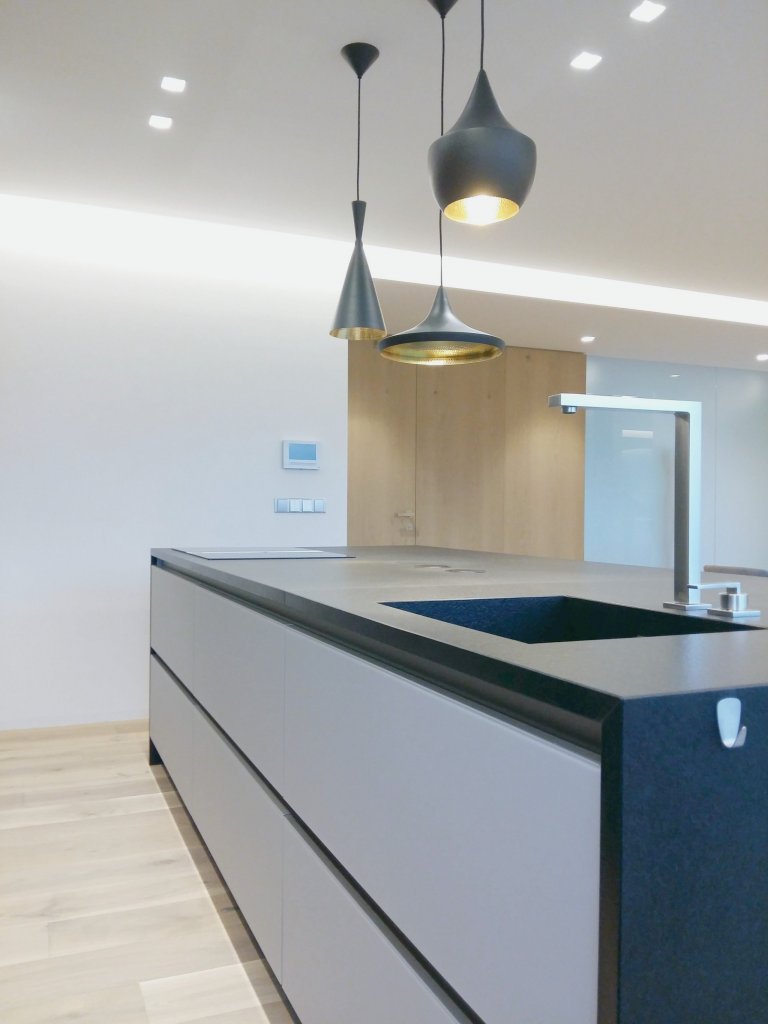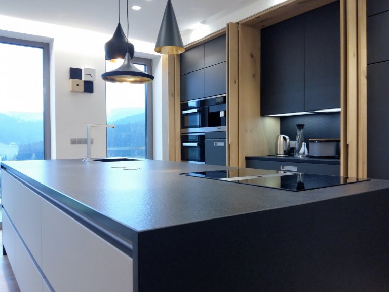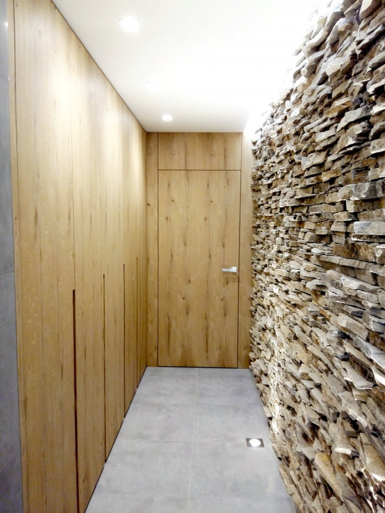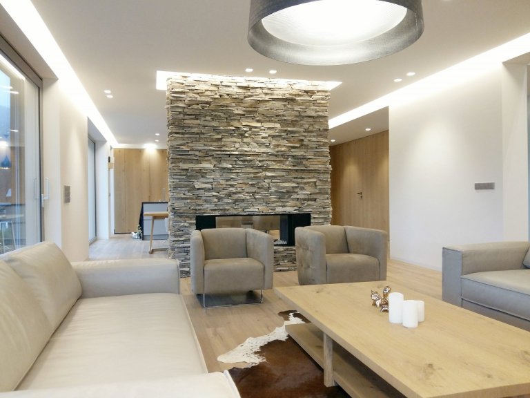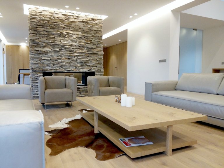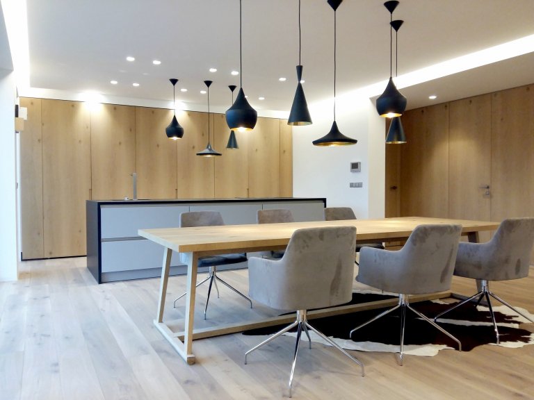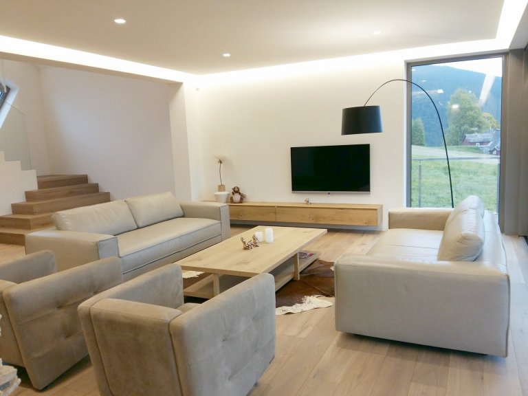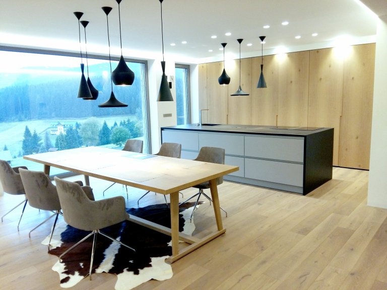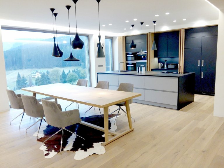 Byli jsme osloveni k návrhu a kompletní realizaci interiéru rodinného domu ve Špindlerově Mlýně. Přáním investora bylo vytvořit jednoduchý a otevřený prostor. V přízemí a horním podlaží je světlá dřevěná podlaha z drásaného dubu. Podlaha, schody a dveře do pokojů mají jednotný minimalistický charakter. Základním motivem při výběru materiálů byla kombinace světlého dubu se zemitými tóny přírodního kamene. Zásádní důraz jsme kladli na atmosféru osvětlení. Spodní podlaží wellnes je vybaveno relaxačním zázemím, zakázkovou saunou a vířivkou USSPA. Koupelny byly vybaveny technikou Dornbracht. Kuchyně Next125 je dodáná v matném skle v kombinaci se satinovaným lakem.
