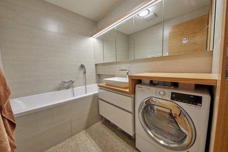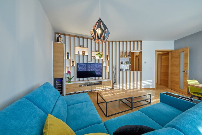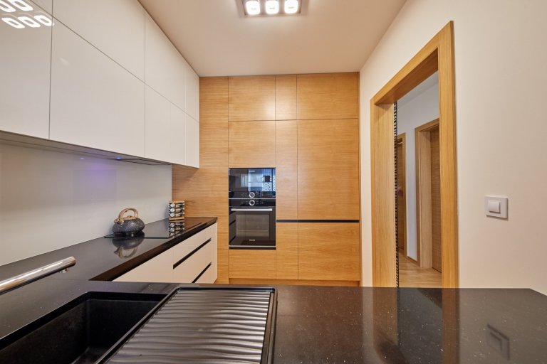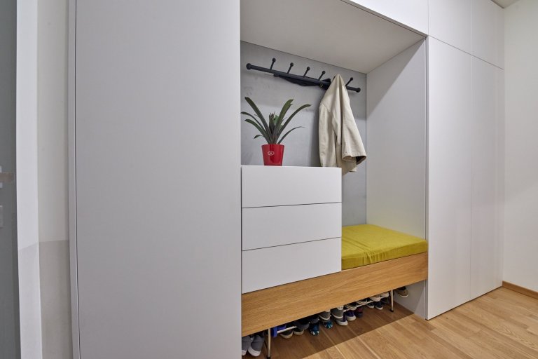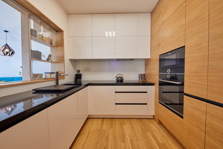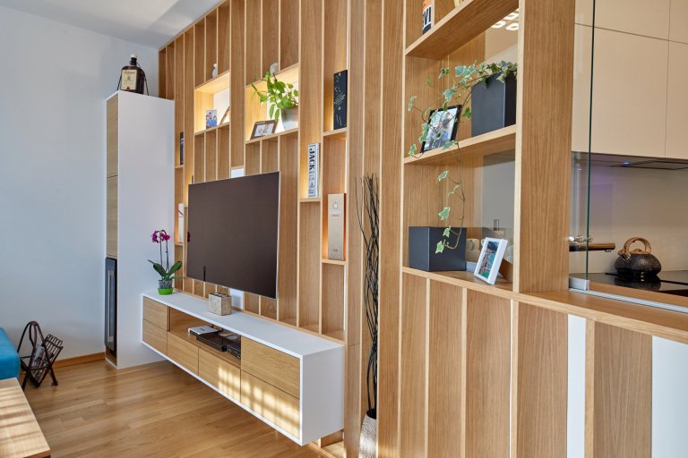 Výnimočné bolo hlavne vyriešenie prepojenia resp. uzavretia kuchyne od obývacej izby. Z pôvodných dverí vzniklo okienko umne zakomponované do nábytkovej časti.