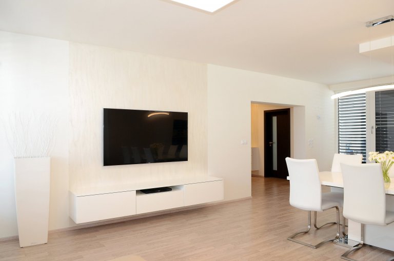 Už když jsme poprvé viděly plány prostorného bytu s výhledem na brněnskou přehradu, bylo nám jasné, že tento prostor má velký potenciál. Díky skvělým klientům a volné ruce při návrhu se nám povedlo jej krásně naplnit. Majitelka miluje bílou barvu a minimalismus, čemuž odpovídá i jeho vzhled. Díky jednoduchému nábytku, světlým barvám a velkým oknům působí celý interiér bytu neobyčejně vzdušně a optimisticky.