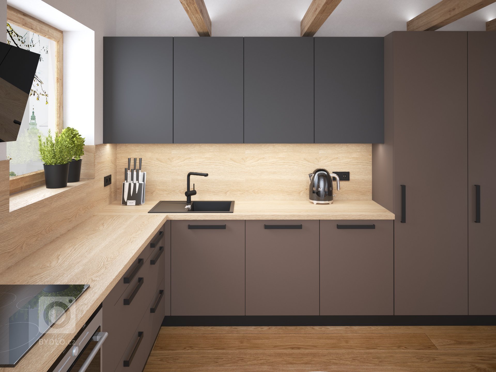 Startovní podkrovní bydlení mladého páru. Jistě vás zaujme jednoduchou dispozicí i útulností. Dominantou je moderní kuchyně v barevné kombinaci elegantní matné hnědé se světlým dekorem dřeva.