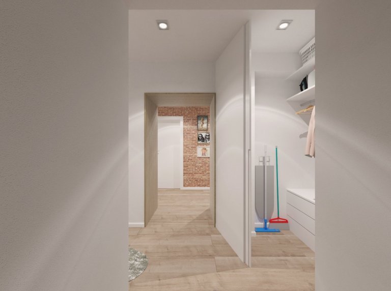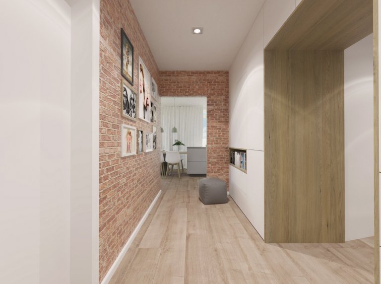 Do vstupnej predsiene sme navrhli skrinky na uloženie topánok a ostatných drobností s lavicou na sedenie. Priestor na vešanie a odkladanie vecí sme ukryli za posuvné dvierka oproti vstupným dverám. V chodbe s tehlovým obkladom sme vytvorili ďalší úložný priestor v podobe dizajnovej nábytkovej zostavy s otvorenými policami na knihy či dekorácie. Dizajnovým prvkom v interiéri je tehlová stena, ktorá celý priestor oživila a zútulnila.