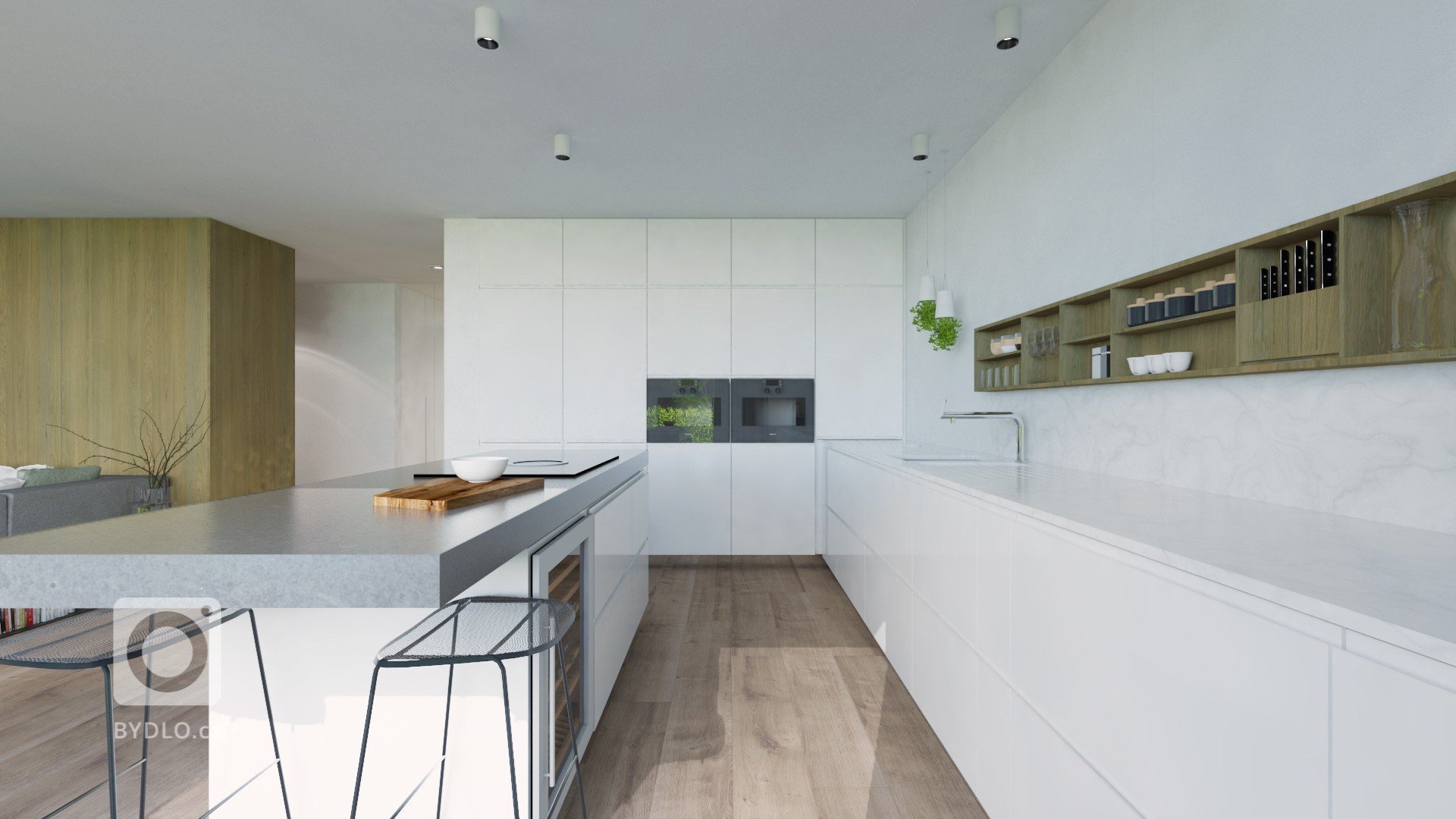 Veľkorysý priestor spoločenskej časti nám dovolil vytvoriť priestrannú kuchyňu s dizajnovým ostrovom, ktorým je čiastočne oddelená od obývacej časti. Biela na skrinkách je doplnená, masívnou kamennou doskou na ostrove a drevenou zostavou políc na koreničky a iné drobnosti. Vznikol tu taktiež…