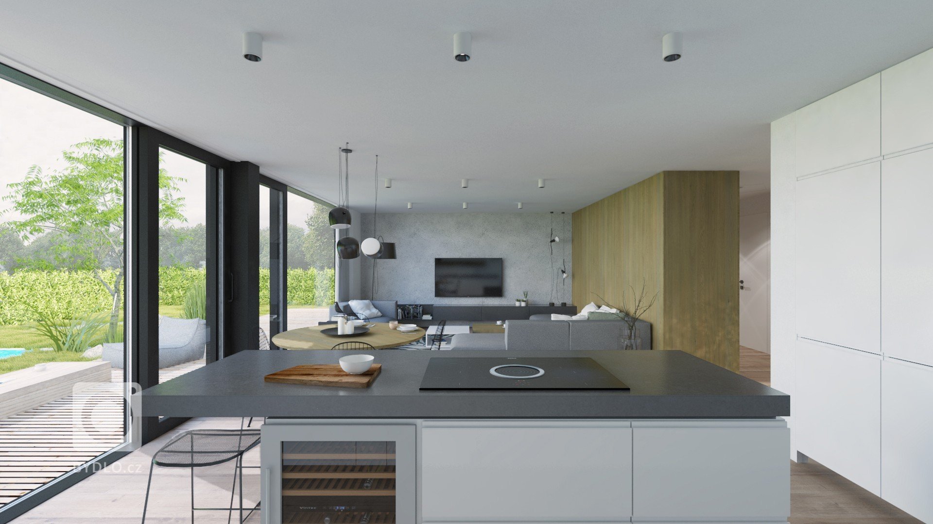 Veľkorysý priestor spoločenskej časti nám dovolil vytvoriť priestrannú kuchyňu s dizajnovým ostrovom, ktorým je čiastočne oddelená od obývacej časti. Biela na skrinkách je doplnená, masívnou kamennou doskou na ostrove a drevenou zostavou políc na koreničky a iné drobnosti. Vznikol tu taktiež…