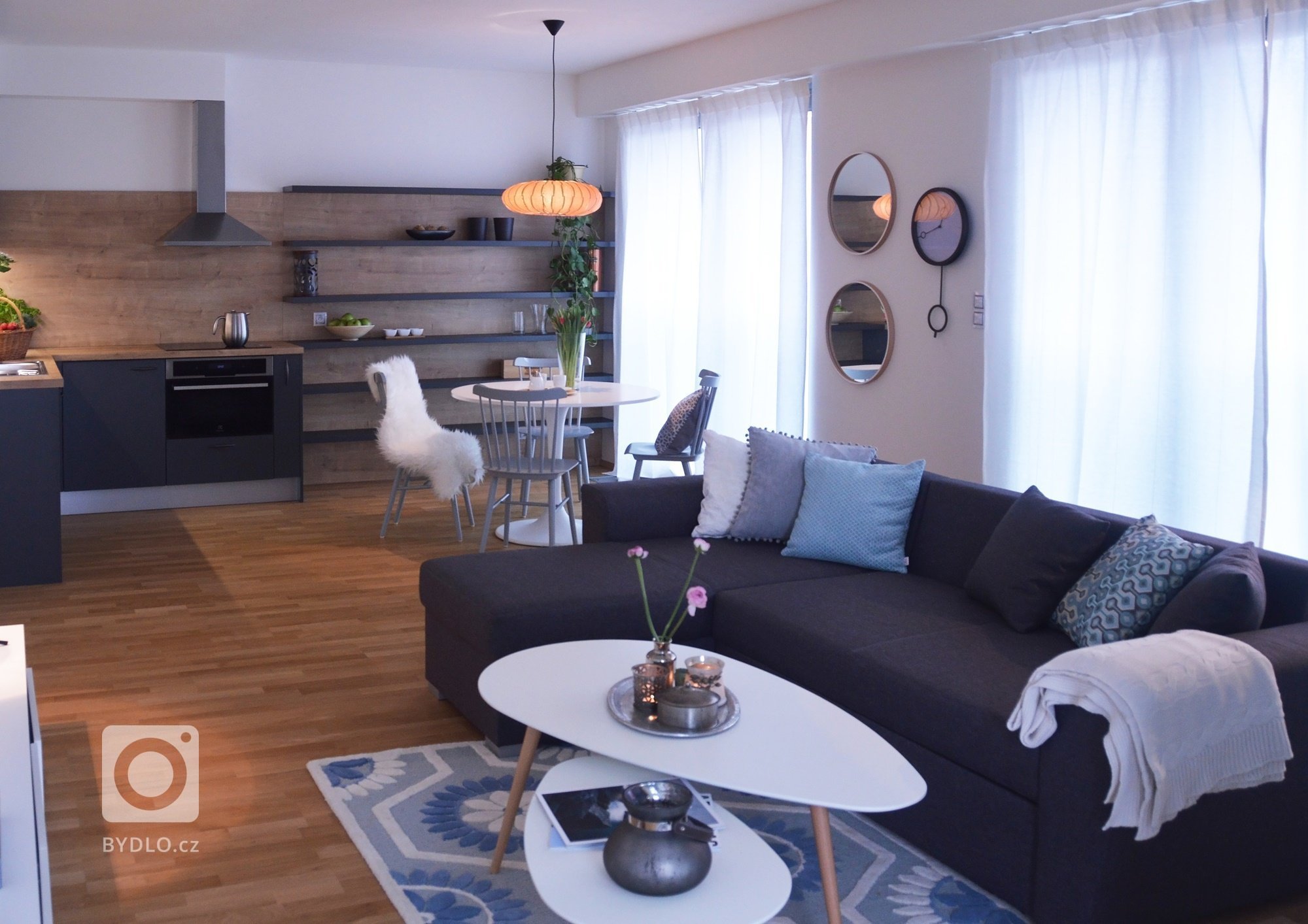 Celkový pohled na obývací a jídelní prostor s kuchyní.