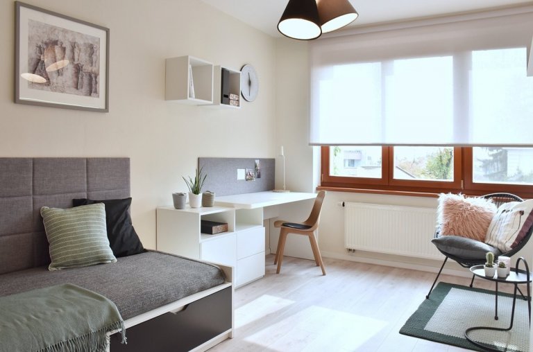 V dívčím pokoji bílou barvu doplňují různé akcenty tmavě zelené, šedé a růžové. Našel se zde i prostor pro knihovnu, pod kterou je v jedné části relaxační koutek s křesílkem, odkládacím stolkem a zrcadlem.