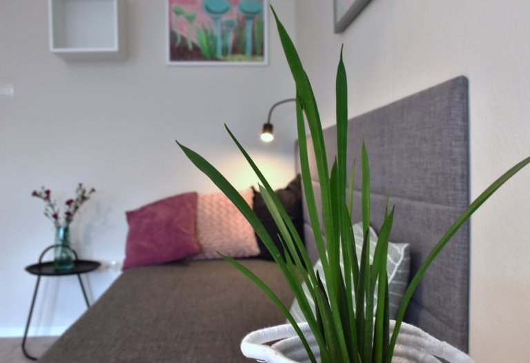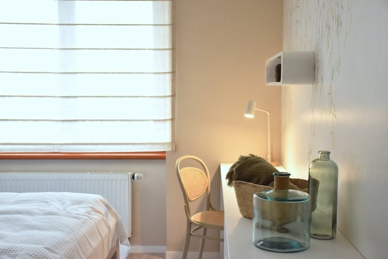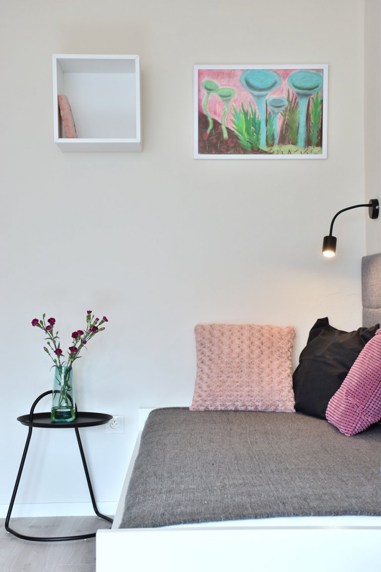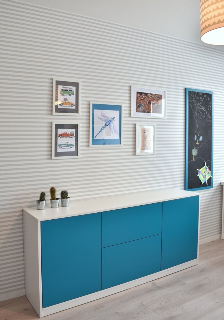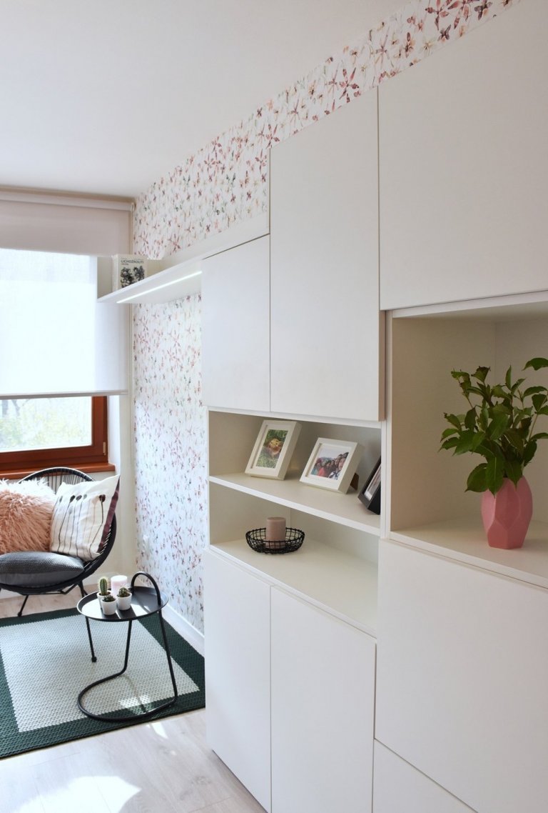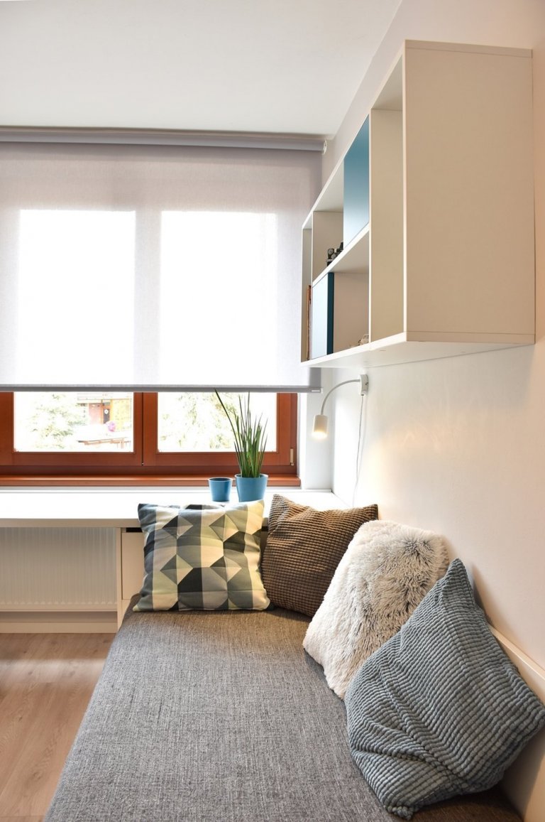 V tomto projektu jsem nejprve bojovala s místem, protože celý byt, který se nachází v 2.NP rodinného domu, je velmi malý a obývá ho čtyřčlenná rodina. Bylo potřeba sjednotit malý prostor barevně a stylově tak, aby byt působil pokud možno vzdušně a jednotně. Zvolila jsem proto ve všech místnostech stejnou podlahovou krytinu v dezénu šedobéžového dubu, veškerý nábytek je v bílé barvě s různými barevnými akcenty dle typu pokoje.