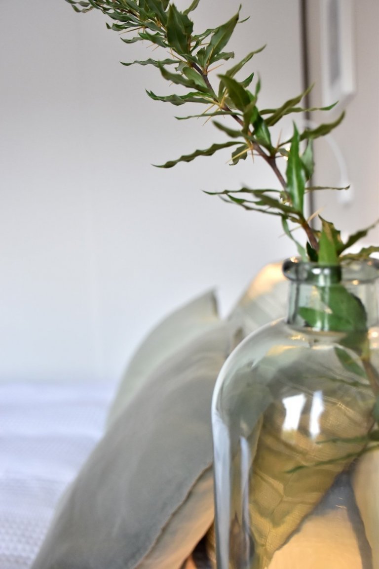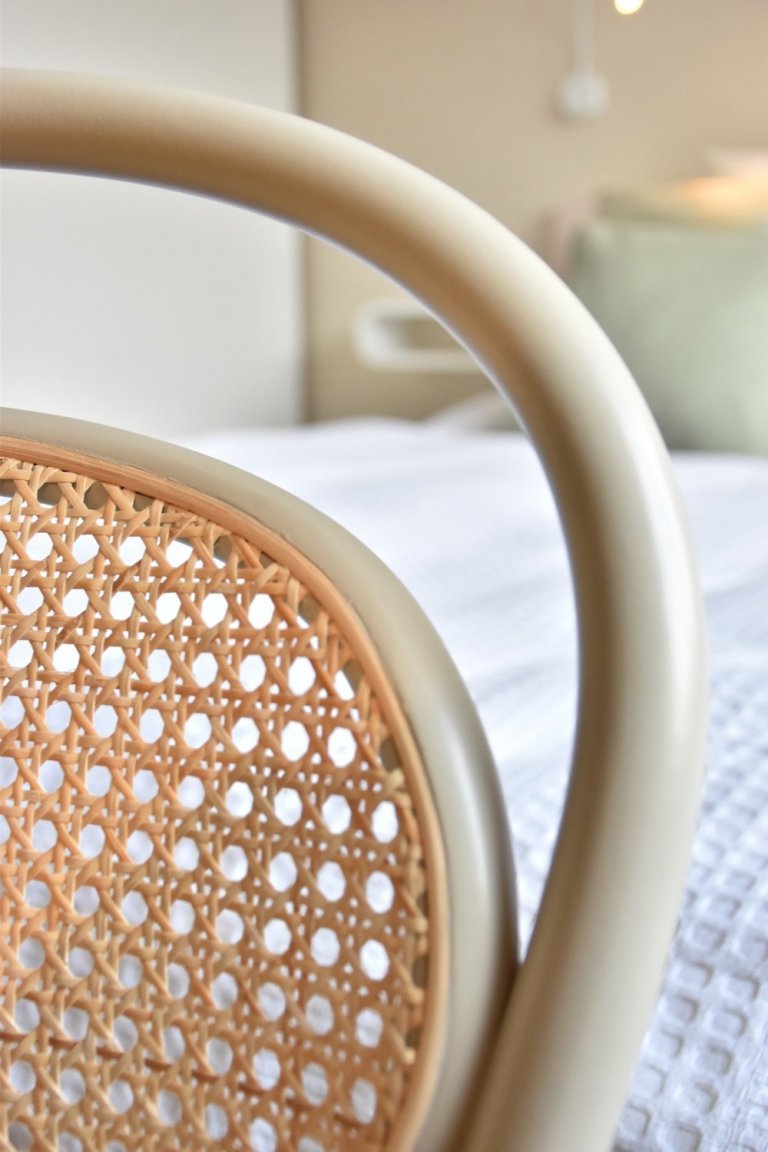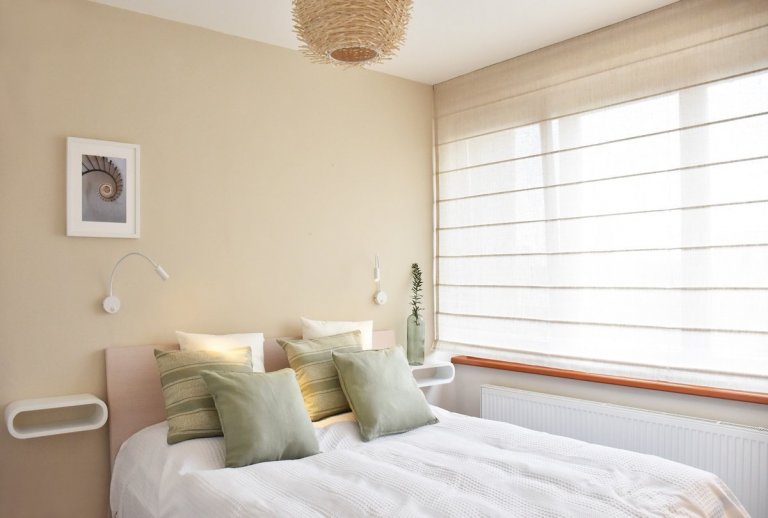 Ložnice rodičů je laděna více do přírodního stylu, proto bílou barvu doplňují béžové a světle zelené akcenty. Do ložnice se vešla i komoda s malým pracovním místem.