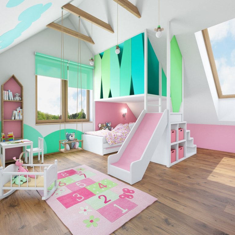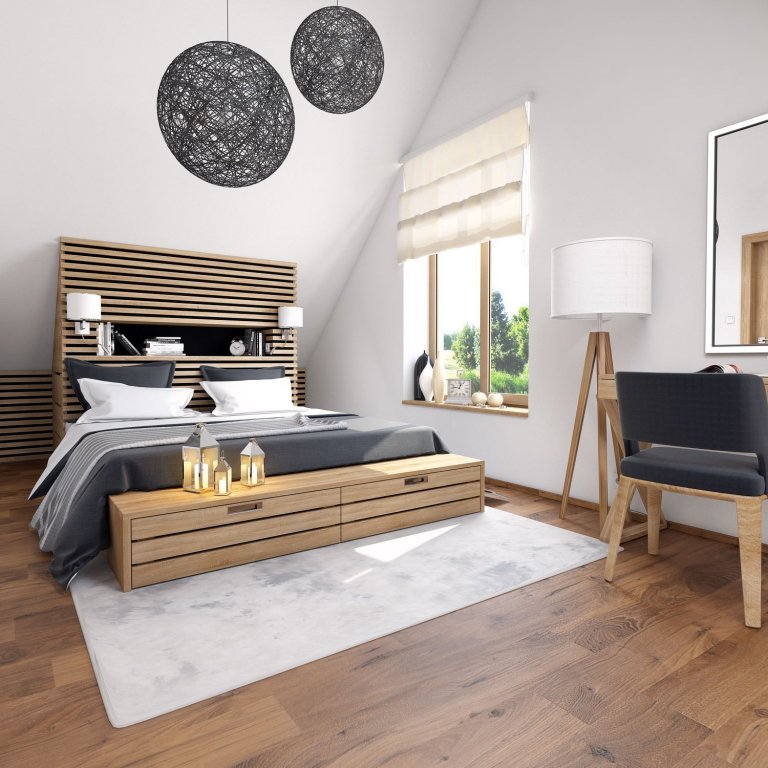Schodiště a chodba na 2NP současně slouží také jako pracovna. V ložnici je velká dřevěná masivní postel a také se našel koutek pro toaletní stolek. Hlavní šatník manželů je umístěn ve vedlejší samostatné místnosti. Koupelna je prostorná a opět se zde ve větší míře objevuje dekor dřeva. V koupelně si přijde na své milovník sprchování i pěnové koupele. Dvě umyvadla jsou také velkým benefitem, zvláště pak v ranních hodinách. Dětský pokoj je nyní navrhnut pro jedno dítě a tvoří jeden velký prostor, sloužící na spaní a hraní. V budoucnu je počítáno s dalším potomkem, a s možností rozdělit tento pokoj na dva stejné a menši pokoje.