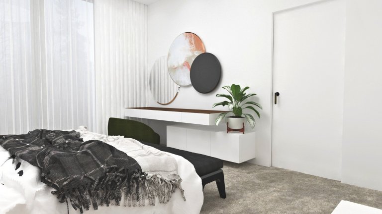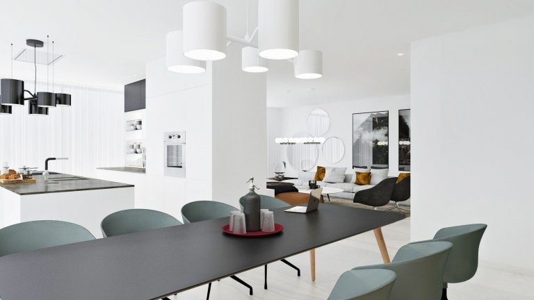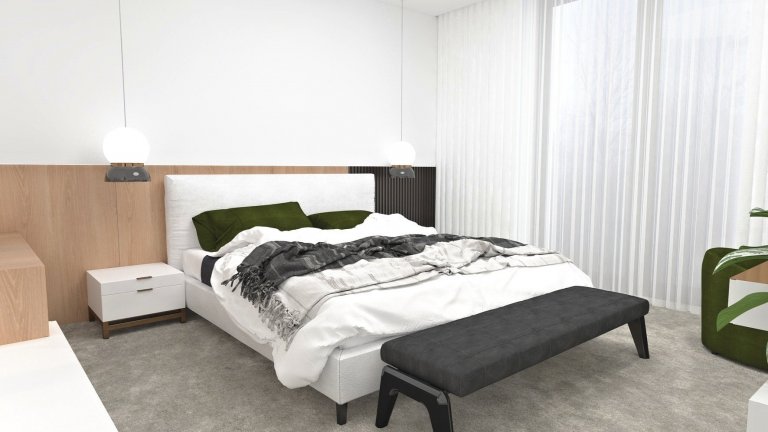 Investor bol otvorený všetkému modernému. Úloha bola jednoduchá – vytvoriť rodinný dom v modernom štýle s myšlienkou minimalizmu, a to najmä farebného. Celý návrh je tak nevinne bledý a v duchu Škandinávie. Ako kontrastové prvky sme zvolili kusy nábytku v spojení biela, dub a čierna. Napríklad pre pracovnú dosku sme zvolili prírodný kameň. Celý interiér tak pôsobí jemne s náznakmi príjemného kontrastu – ako odtieňového, tak aj materiálového.