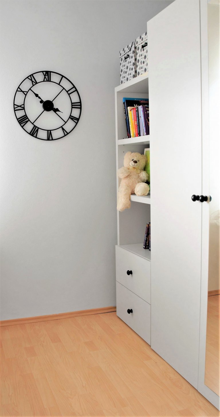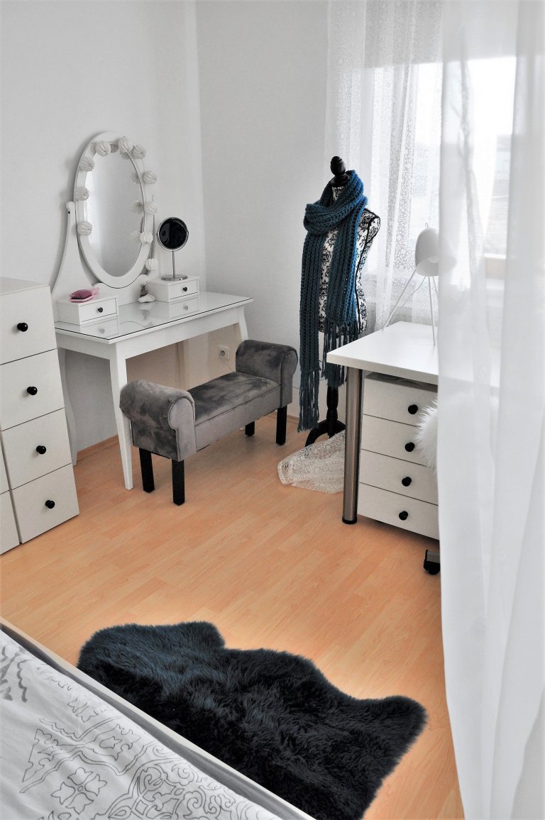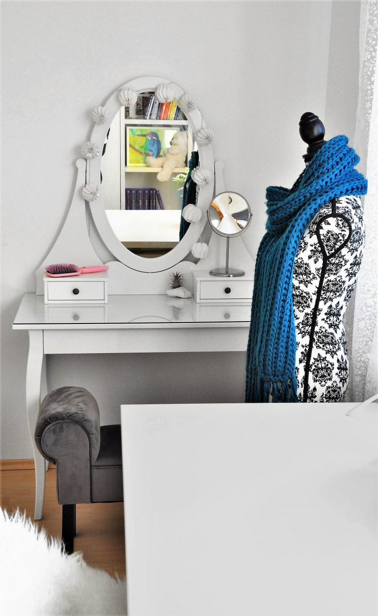 Vzhledem k předchozí barevné přesycenosti jsme se snažili tento vjem co nejvíce utlumit. Pokoj působil divoce, dětsky a nenavozoval potřebnou pohodu a klid potřebný pro studium a odpočinek. Právě proto jsme dospěli k tomu, že pouhou úspornou výměnou a doplněním dvířek nábytku dosáhneme požadovaného efektu. Bílou barvu kombinovanou s černou na detailech nábytku jsme oživili tyrkysovou na textiliích a zlatou v doplňcích. Nábytek jsme přemístili tak, aby byl pokoj rozdělen na funkční zóny. Vybavení pokoje jsme doplnili o nezbytný toaletní stolek a stoličku. Princeznovský nádech dodal pokoji „baldachýn“ u postele, který vytváří dojem pokoje v pokoji.