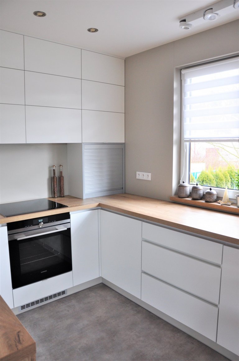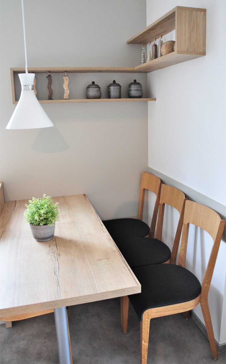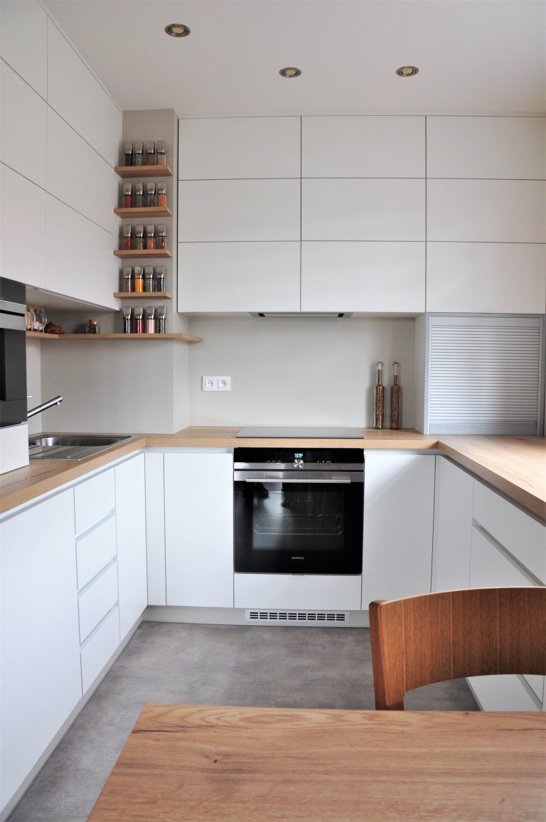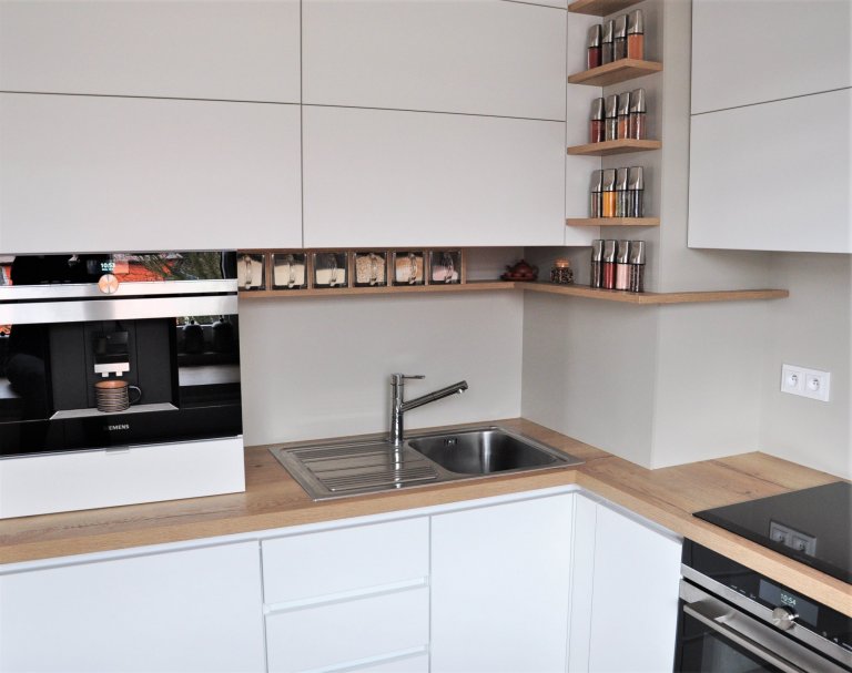 Došlo tedy k výměně kuchyňské linky a spotřebičů včetně navazujícího jídelního stolu, obložení stěn a výměně podlahové krytiny. Nově jsme doplnili i svítidla tak, aby se stylově potkala se světly v navazujícím obývacím pokoji.
