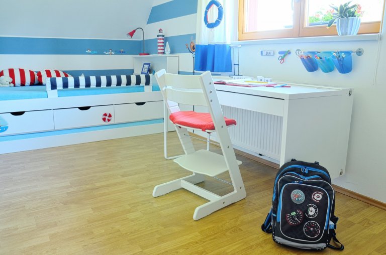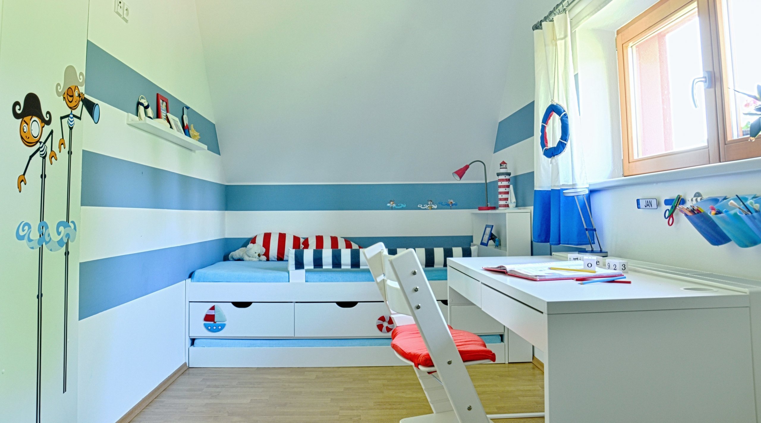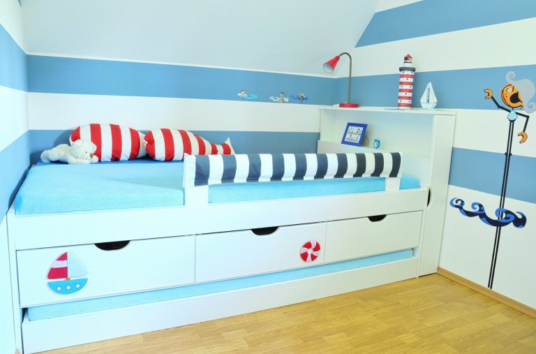 Náladu pokoje doplňují tématické nálepky a textilní doplňky. Pokoj s chlapcem může růst - stačí jen slepit nálepky a vymalovat. Nábytek je v bílé - nadčasové barvě, aby nebylo potřeba vybavení za několik let vyměnit.