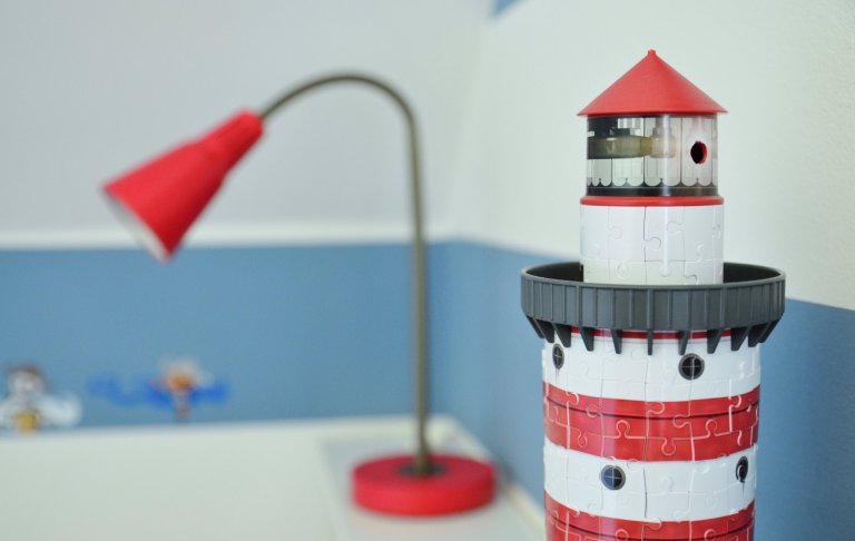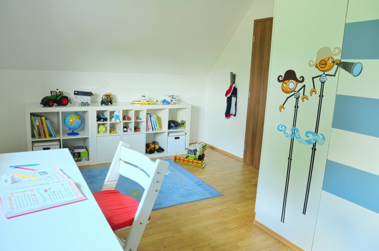 V pokoji bylo třeba vytvořit zónu na spaní, hrací koutek a do budoucna učení. Postel je zrealizována jako vestavěná do niky pod šikminou - atypická, na míru vyrobená postel s úložným prostorem na lůžkoviny za samotným lůžkem. Pod postelí ještě zásuvky na hračky a náhradní lůžko pro kamarády.