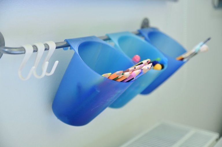 Stůl je umístěn pod okno kvůli dostatku světla a v pravé části místnosti je ještě místo na regály na nejrůznější věci a zatím ještě i na hračky.