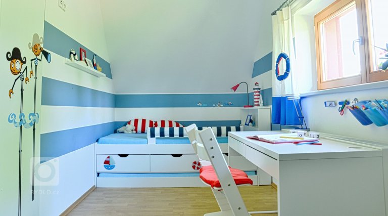V pokoji bylo třeba vytvořit zónu na spaní, hrací koutek a do budoucna učení. Postel je zrealizována jako vestavěná do niky pod šikminou - atypická, na míru vyrobená postel s úložným prostorem na lůžkoviny za samotným lůžkem. Pod postelí ještě zásuvky na hračky a náhradní lůžko pro kamarády. …