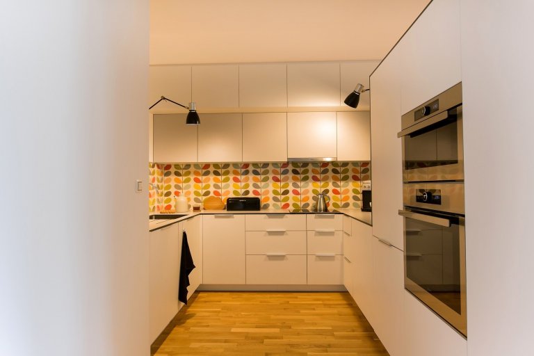 Nábytek je vyroben na míru dle našeho návrhu, opět v nadčasové, neutrální a odolné materiálové kombinaci- lakovaná překližka a bílé lamino.
