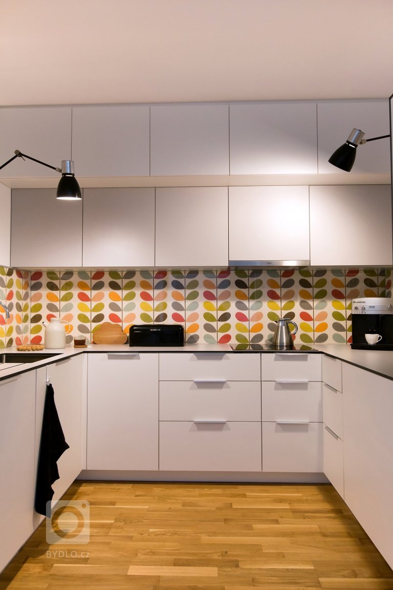 Koncept byl jasný- jednoduchá světlá linka vyladěná tapetou od Orly Kiely, která celý prostor rozzáří. Kuchyň se nachází v tmavém koutě bez okna, proto je linka dostatečně osvětlená nejen LED pásky, ale také repasovanými strojírenskými lampami. Barevná tapeta je kryta kaleným sklem a lze ji…